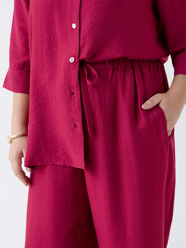 These magenta solid pants from Gia are designed for effortless comfort and style. Crafted with a smooth elastic waistband and adjustable drawstrings, they ensure a secure yet relaxed fit. A practical side pocket adds everyday functionality, making them a versatile choice for pairing with tunics or casual tops.