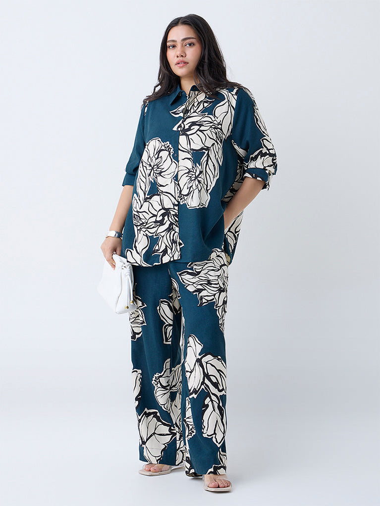 Teal trousers by Gia crafted with subtle foliage motifs that bring visual interest while elongating the frame. Designed in a breathable fabric with a gentle drape, they feature an elasticated waistband for a contoured yet comfortable fit. Side pockets ensure everyday ease, making them a stylish essential for polished weekday dressing or relaxed weekend looks.