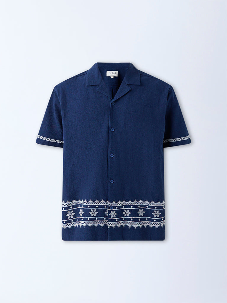 ETA Navy Embroidered Relaxed-Fit Cotton Shirt