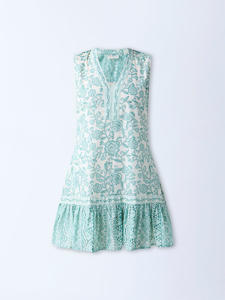 Bombay Paisley Green Floral Pattern Cotton Drop Waist Dress