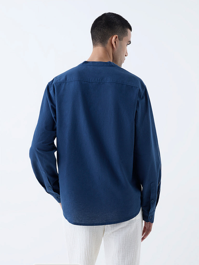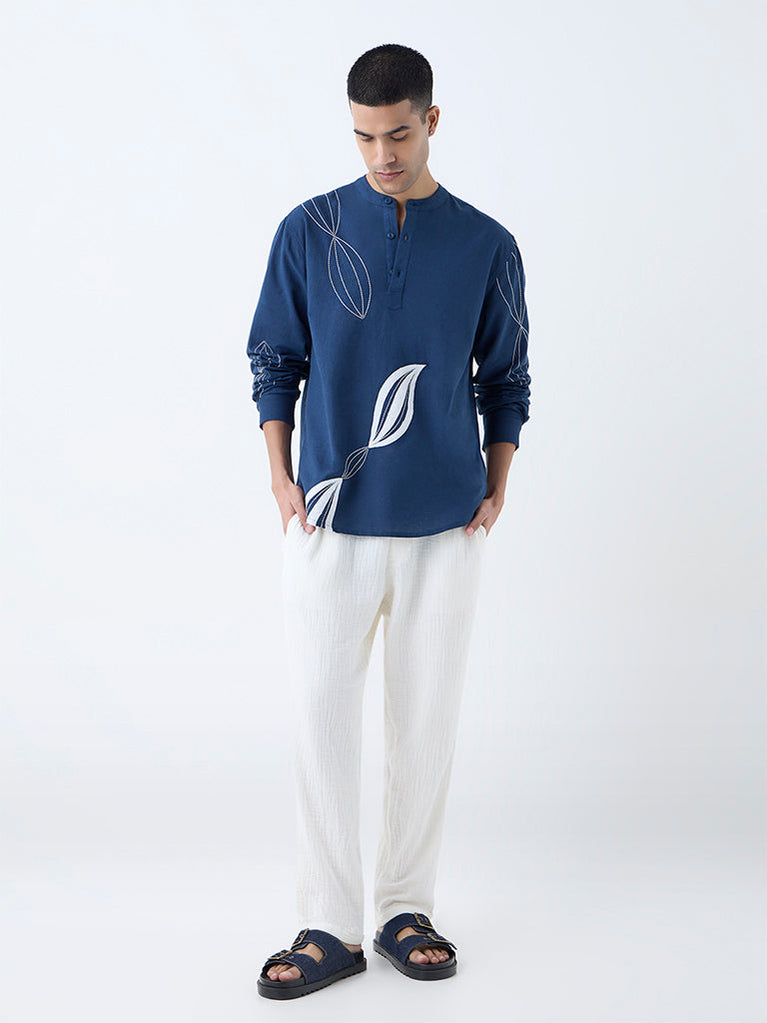 Make every outing effortlessly stylish with this indigo shirt from ETA. Showcasing abstract embroidery on a relaxed silhouette, it blends contemporary design with casual ease. Structured with a mandarin collar, button placket, and full sleeves, the cotton-rich garment ensures utmost comfort from AM to PM.