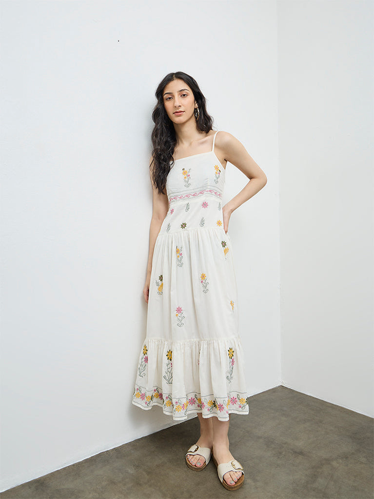 Bombay Paisley Off-White Floral Embroidered Cotton Tiered Dress
