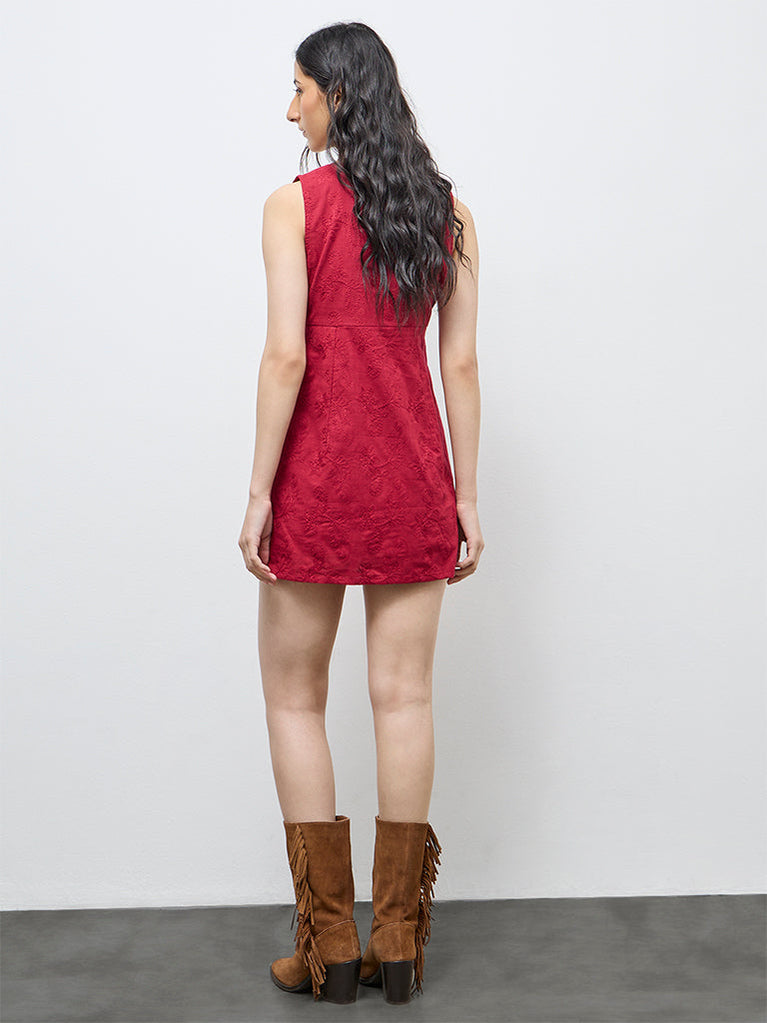 Bombay Paisley presents this crimson-hued cotton dress designed in a clean red straight silhouette. The sleeveless cut is complemented by a deep V-neckline, while underbust stitch-detailing shapes the form. Subtle floral embroidery is worked across the fabric, adding delicate texture and a handcrafted finish to the breathable cotton base.