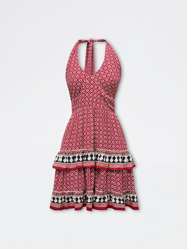 Bombay Paisley presents this red printed dress crafted from pure cotton for a light, breathable feel. The halter neckline is secured with a tie-round detailing, the neckline extends into a plunging V-shape framed by underbust stitching. Finished with a smocked back, an A-line silhouette and layered frills, it offers fluid movement and soft volume.