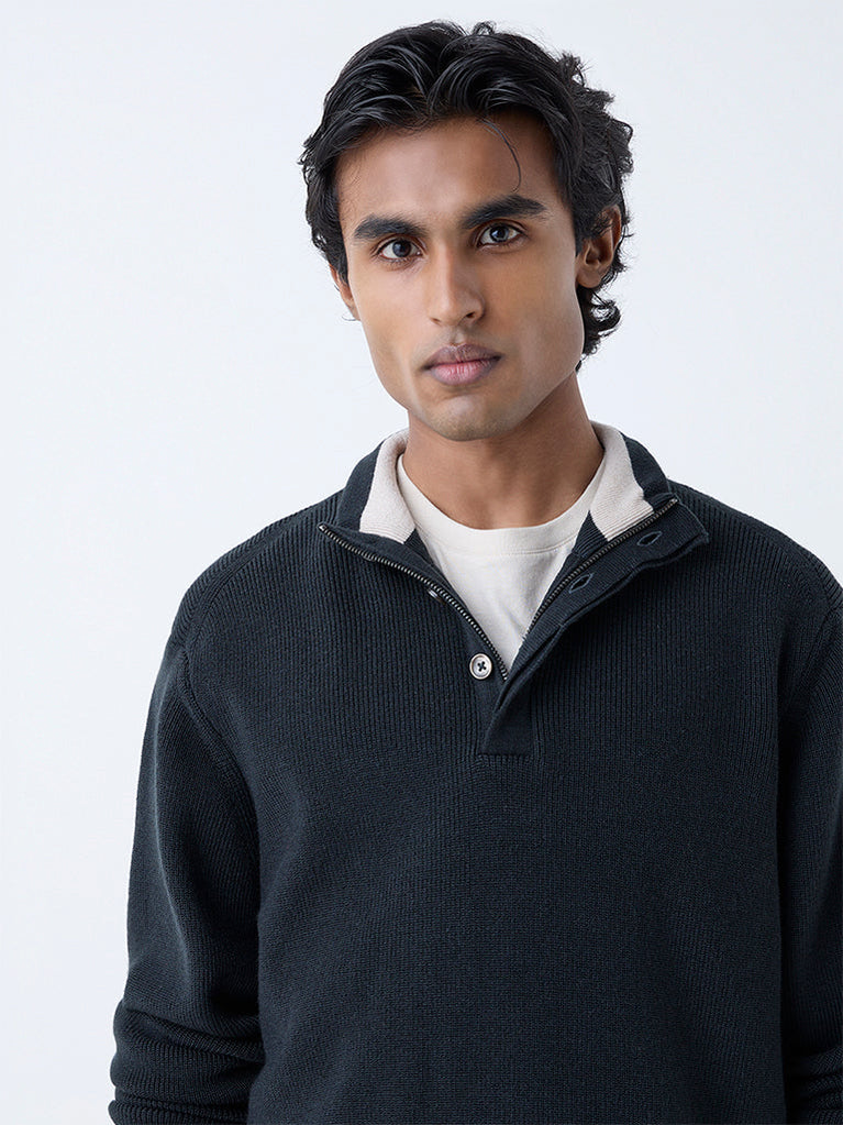 Ascot introduces a navy sweater designed to anchor the modern wardrobe. The knit texture adds dimension, while the high neck with zip-and-button detailing offers functional sophistication. Relaxed in fit yet elevated in finish, it delivers warmth and quiet confidence in equal measure.
