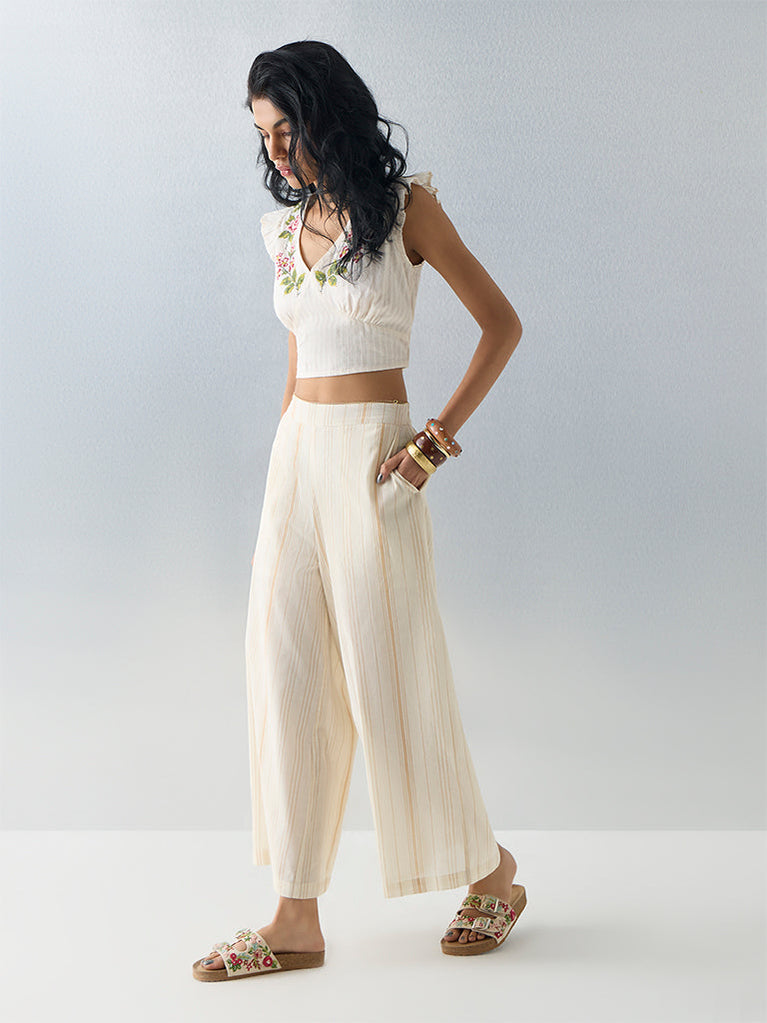 Bombay Paisley Light Beige Striped Cotton-Blend Palazzos