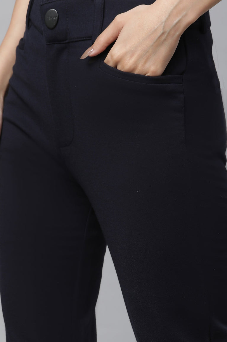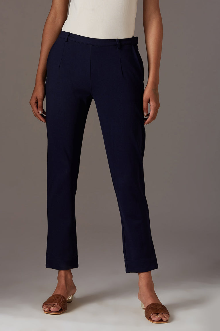 Crafted for the modern professional, these navy blue slim-fit trousers combine style and comfort effortlessly. The soft knit fabric offers a luxurious hand feel and stretchability, ensuring all-day ease. Featuring functional front pockets, a front zip with button closure, and an elasticized waist belt, these trousers are as practical as they are chic. Perfect for formal occasions, they pair seamlessly with a crisp shirt or a tailored blazer for a polished look.