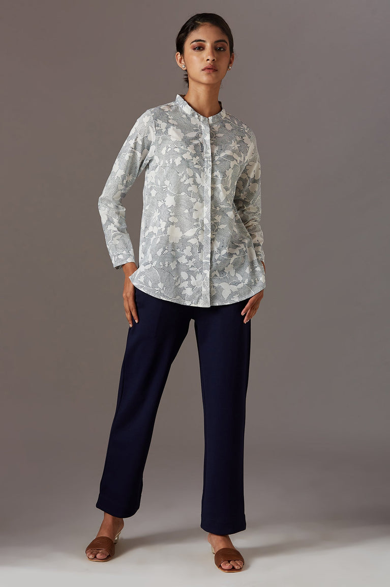 A Regular Fit Shirt With Broad Placket Crafted In Hand Block Printed Voile, Features Border Detail On Sleeve Cuff And Hangings Below The Placket.