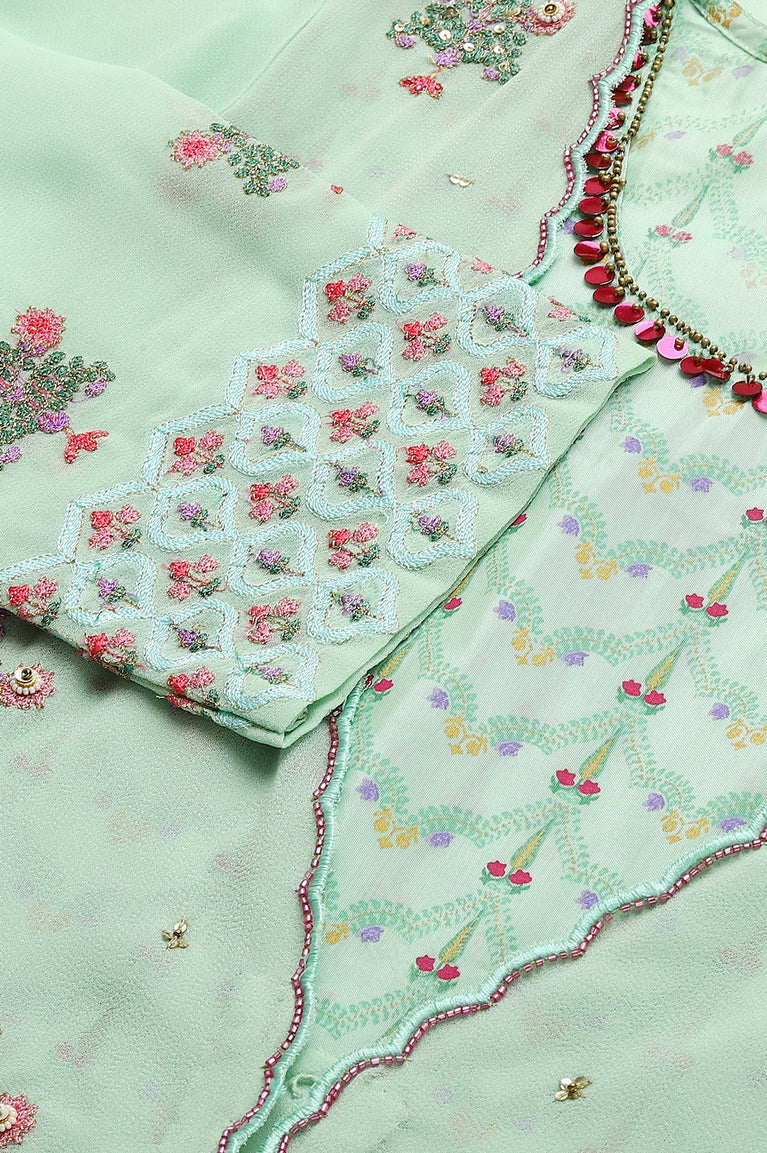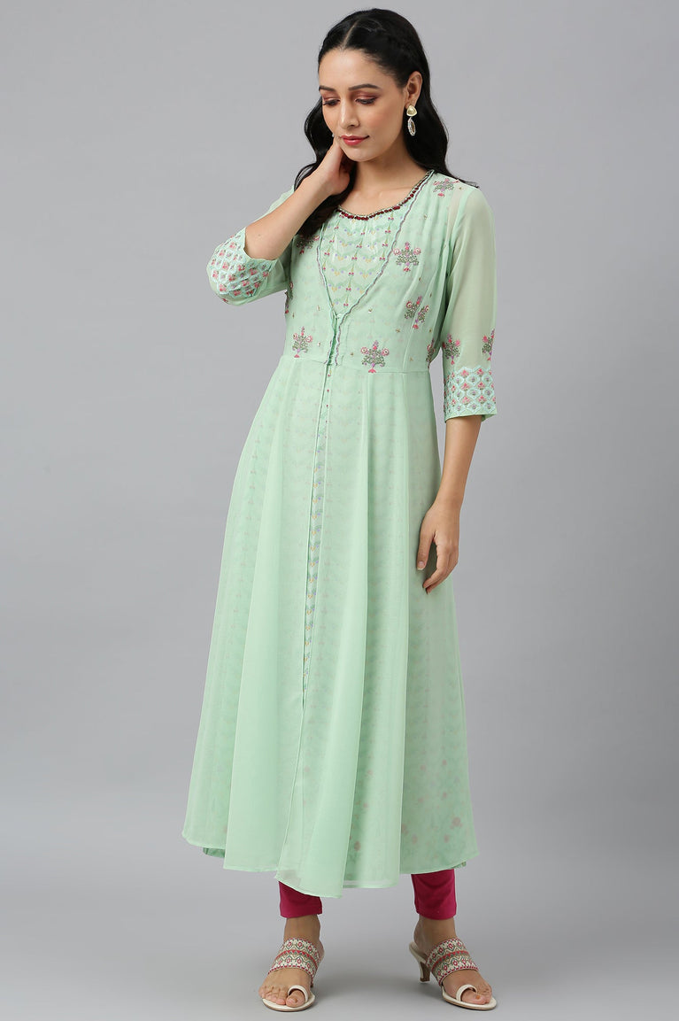 Printed Mint Green Shantung Kurta With Embroidered Georgette Overlay And Tights