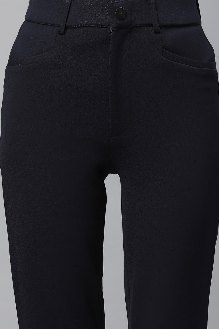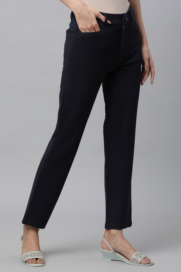 Navy Blue Solid Slim Fit Trousers With Elasticated Waist