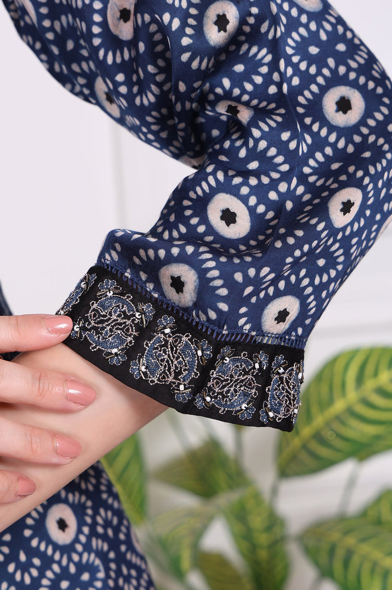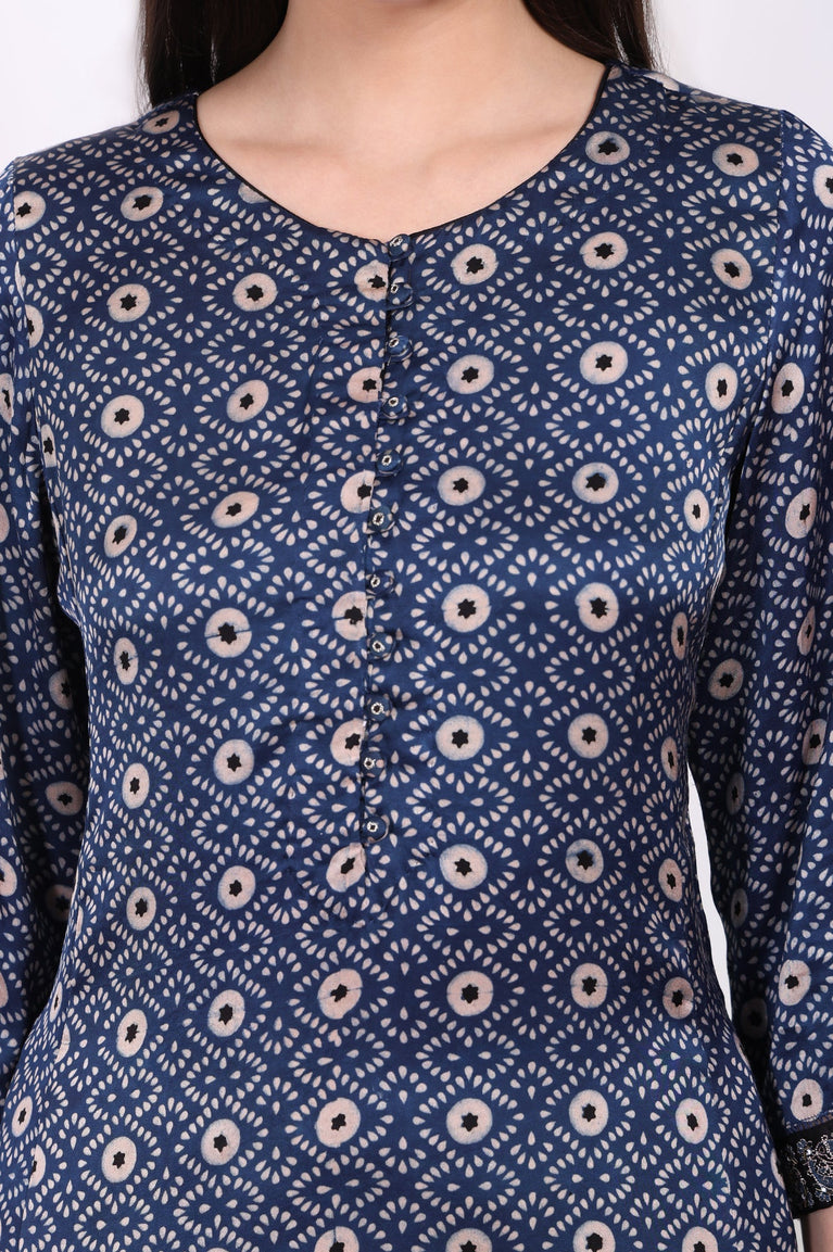 Effortlessly stylish, this navy blue geometric printed kurta is crafted from modal satin for a soft and breathable feel. The round neckline and embroidered cuffs add a touch of elegance, while the straight silhouette ensures comfort and versatility. Perfect for casual outings or festive occasions, this kurta is a timeless addition to your wardrobe.