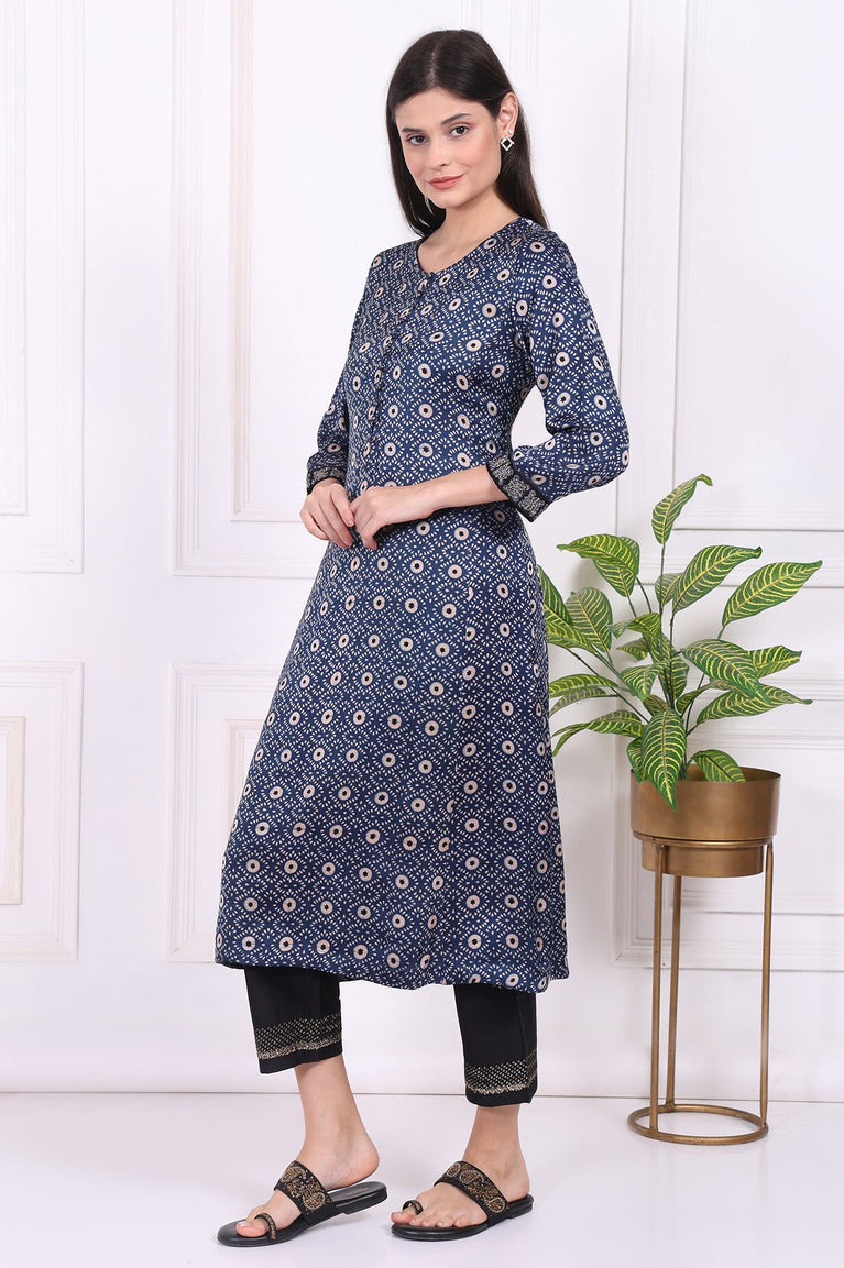 Navy Blue Geometric Printed Embroidered Modal Satin Straight Kurta