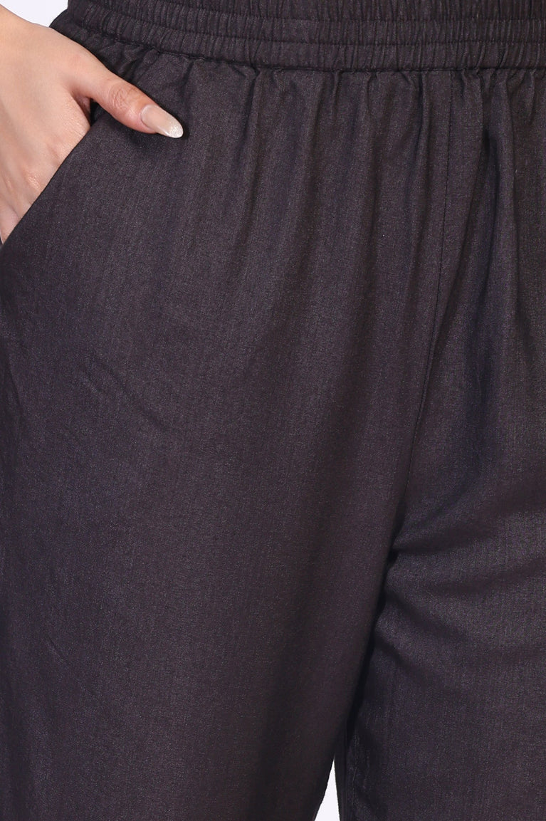 Timeless sophistication reimagined, this Black kurta set for women is a masterclass in understated elegance. The ensemble glides with a quiet confidence, making it a perfect choice for evening soirées and festive gatherings where you want to make a statement. At its heart is a beautifully tailored straight-cut kurta, crafted from a fabric with a subtle, inherent texture that catches the light. The V-neckline serves as a canvas for exquisite Zari and sequin embroidery, a detailed ornamentation that speaks of artisanal craftsmanship. This stunning motif extends to the cuffs of the elegant three-quarter sleeves, adding a touch of shimmer with every gesture. This stunning ethnic co-ord set offers a flawless straight silhouette, thoughtfully designed with side slits for graceful movement and a clean, straight hemline that falls to a chic calf length. It’s paired with comfortable straight pants featuring a fully elasticated waistband for an easy fit, and they echo the theme with a lustrous woven jacquard border at the hem. To complete the look, a matching jacquard dupatta drapes beautifully, tying together this opaque and impeccably styled kurti set. This three-piece ensemble, including the kurta, pants, and dupatta, is your definitive answer to effortless, modern festive dressing.