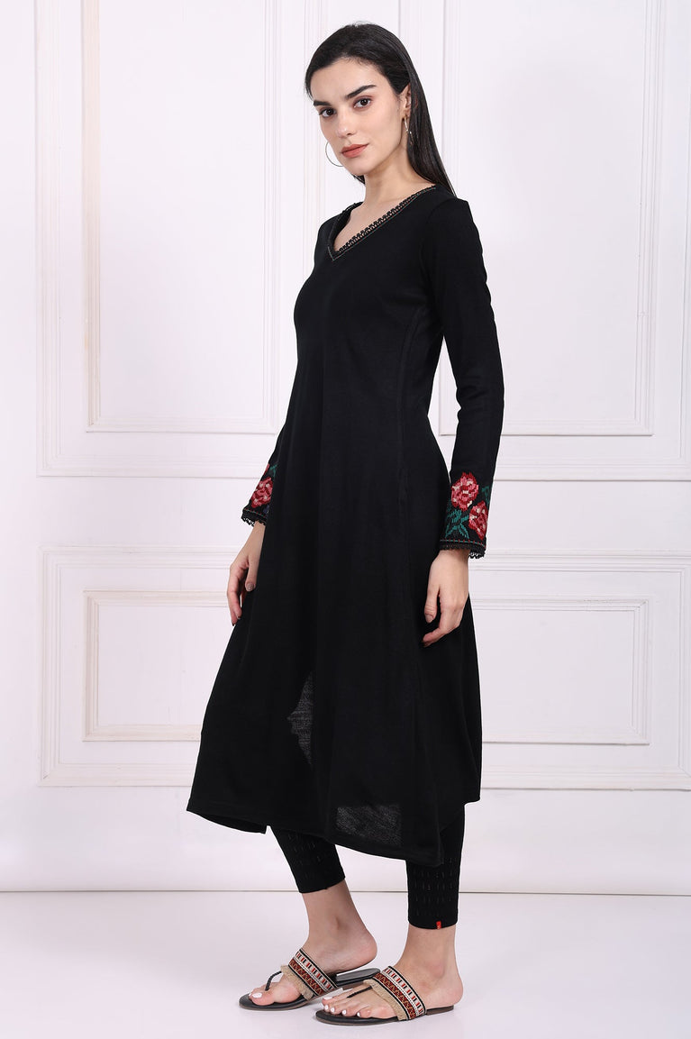 A winter wardrobe essential that speaks volumes in its subtlety. This A-line kurta for women is rendered in a deep Onyx Black, offering a canvas of quiet sophistication. Its true charm lies in the exquisite details that set it apart. A graceful V-neckline is delicately traced with fine lace, adding a touch of romance and intricate texture to the simple silhouette. The full-length sleeves become a focal point, culminating in a stunning burst of vibrant floral embroidery that provides a captivating contrast against the dark, solid fabric. A whisper of matching lace at the cuffs harmoniously echoes the neckline's design. This elegant apparel is crafted from a soft, warm fabric that drapes beautifully, falling to a modest calf length with a clean, straight hemline and functional side slits for ease of movement. The solid, unadorned body ensures all attention remains on the exquisite ornamentation. You'll find this opaque long sleeve winter kurti is a piece you reach for repeatedly for its perfect blend of cozy comfort and undeniably refined style.