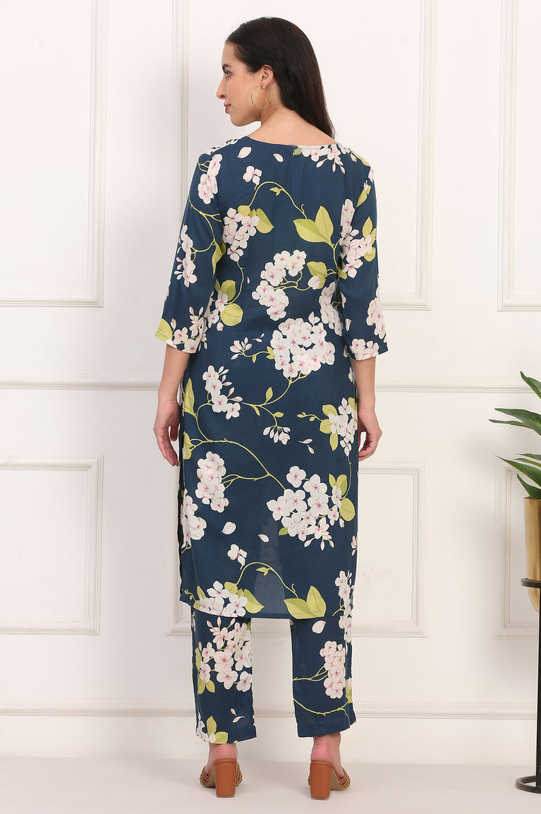 Navy Blue Floral Printed Straight Pure Cotton Kurta and Straight Pants Co-ord Set