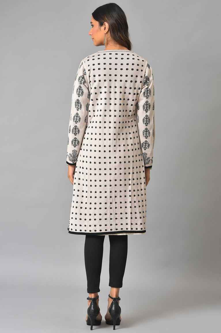 Black And Ecru Geometric Print Straight kurta In Round Neckline With Button Closure. It Is Paired With Black Solid Parallel Pants.