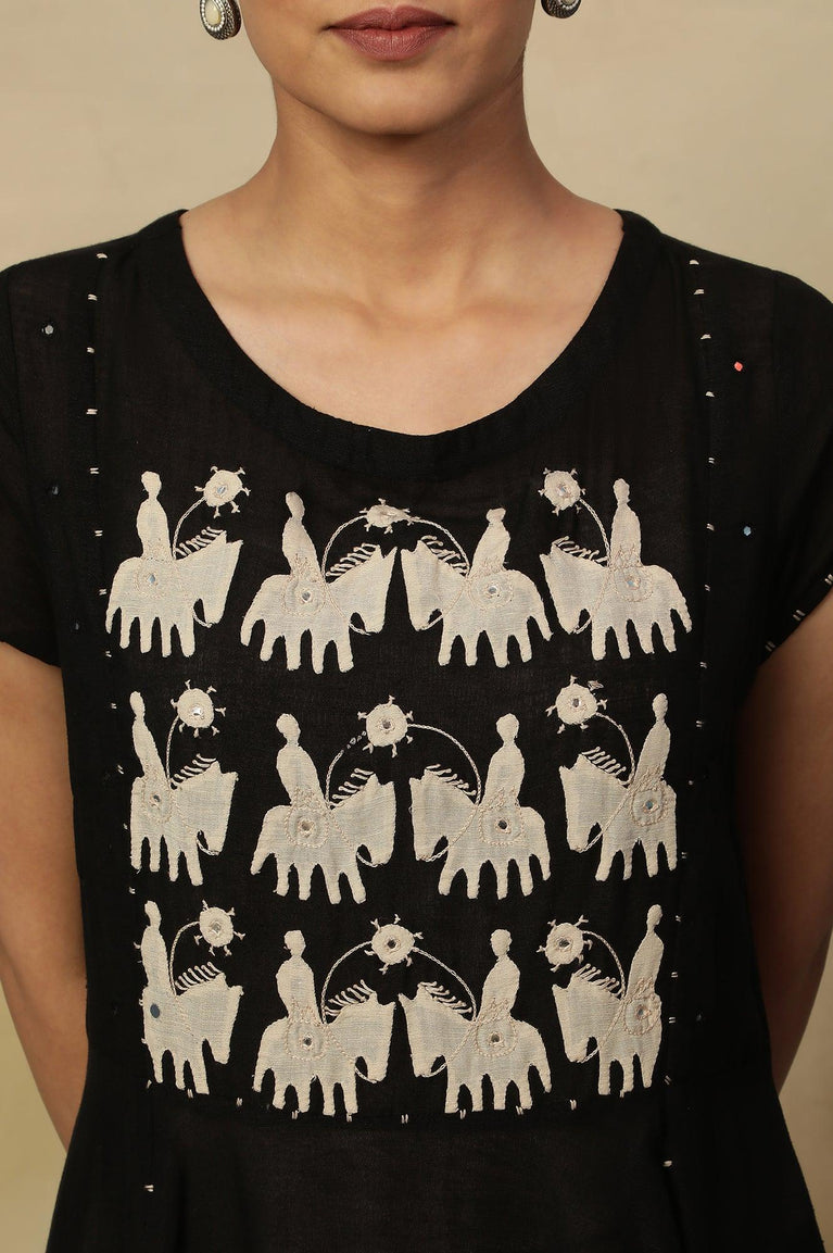 A Beautifully Crafted Flared Dress In Black Modal Flax. Features Meticulously Designed Hand Done Applique Embroidery At Front Yoke ,Highlighted With Kantha And Mirror Work. Enhanced With Nice V Shape Cut And Tie -Up Detail At Back.