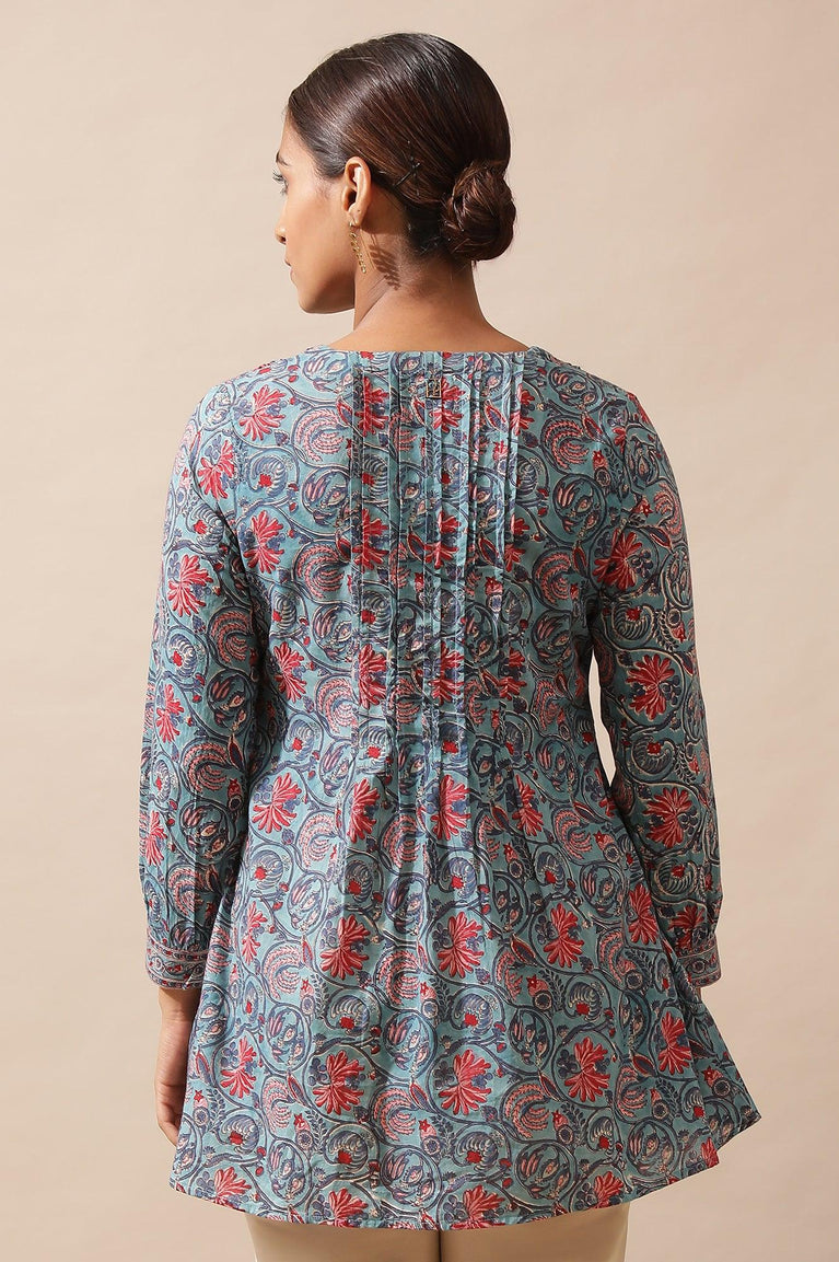 A Round Neck Ajrakh Print Top With Round Neck And Front Placket That Has Fabric Covered Buttons. Top Is Furthered Finished With Cuffed Sleeves.