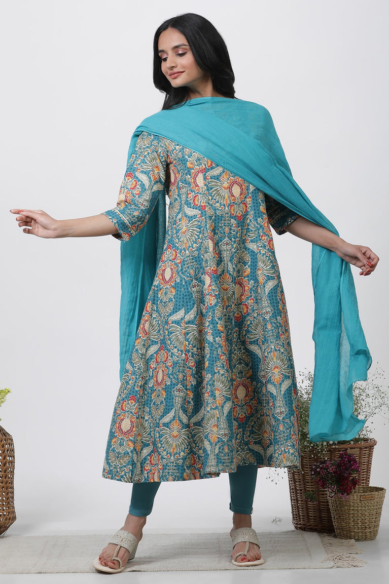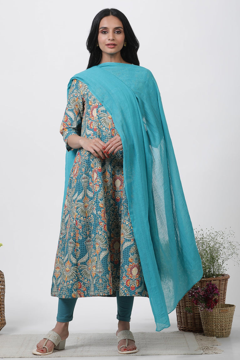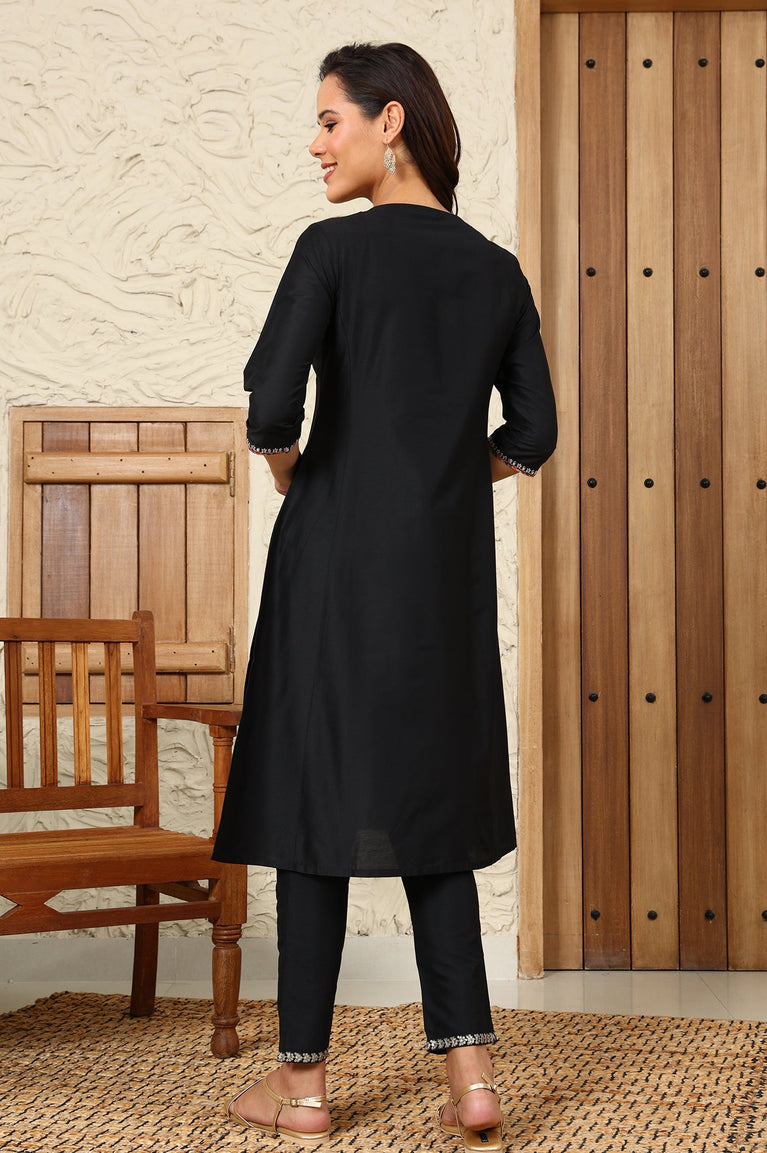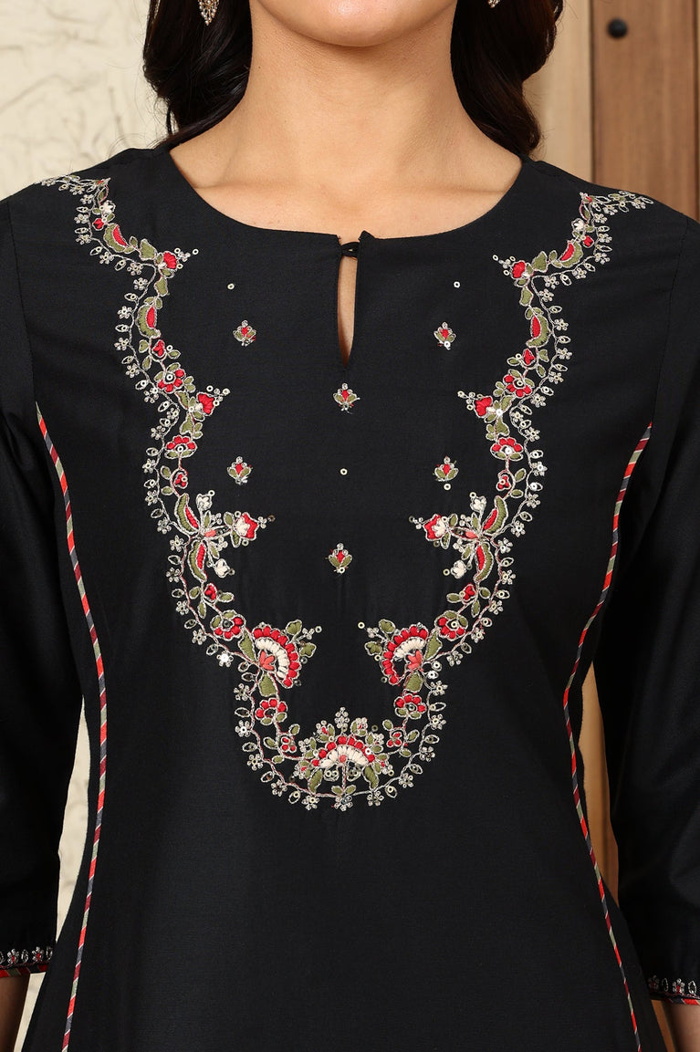 Black Floral Printed Japenese Satin Embroidered A-Line Kurta And Pants Set With Dupatta