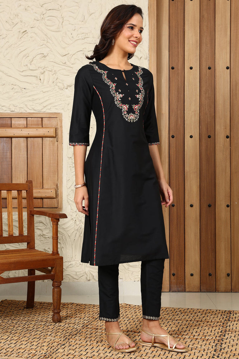 Elevate your festive style with our black solid dori embroidered straight kurta. This classic black kurta exudes sophistication with its sleek, straight-cut silhouette, offering a timeless and versatile look. The kurta features exquisite dori embroidery, meticulously crafted to add a touch of intricate elegance and sparkle to the design. The rich black fabric serves as a perfect canvas for the delicate embroidery, enhancing its festive charm. Ideal for special occasions and celebrations, this kurta combines understated luxury with modern grace, ensuring you stand out with effortless poise and style.
