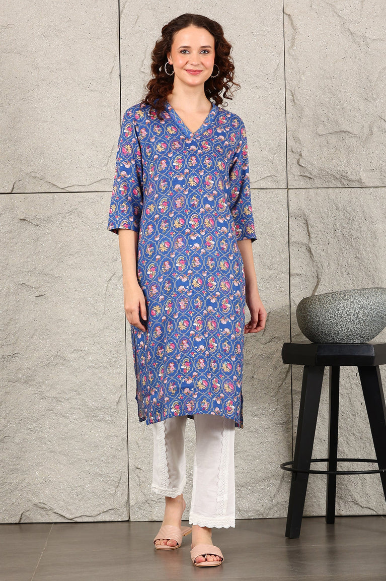 Introducing Our Cotton Blend Blue Straight Kurta Set, A Stunning Choice For A Polished And Sophisticated Look. This Elegant Ensemble Features A Straight Silhouette That Drapes Beautifully, Offering Both Comfort And Style. The Kurta Showcases A Charming Floral Print In Vibrant Hues, Adding A Touch Of Freshness And Grace To Your Wardrobe. The V-Neck Design Enhances The Kurta’S Refined Aesthetic, Creating A Flattering Neckline That Suits A Variety Of Accessories. For A Cohesive And Chic Appearance, The Set Includes Matching Straight Pants That Perfectly Complement The Kurta’S Design. Ideal For Both Casual Outings And Special Occasions, This Blue Straight Kurta Set Ensures You Look Effortlessly Stylish And Refined.