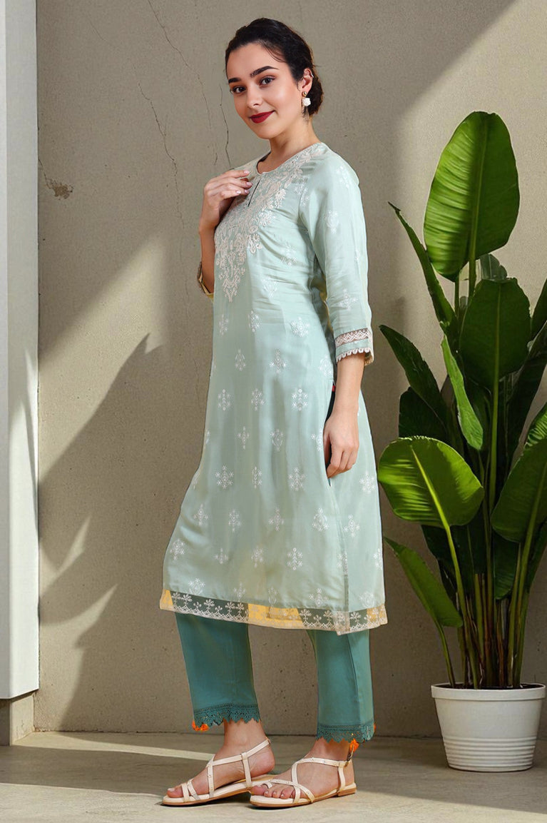 Add a splash of artisanal charm to your outfit with these blue ankle-length pants. Thread embroidery in shantung lends a touch of refined texture, while the tailored parallel silhouette works with both contemporary and ethnicwear looks. Best suited for festive ethnicwear moments that call for subtle elegance.