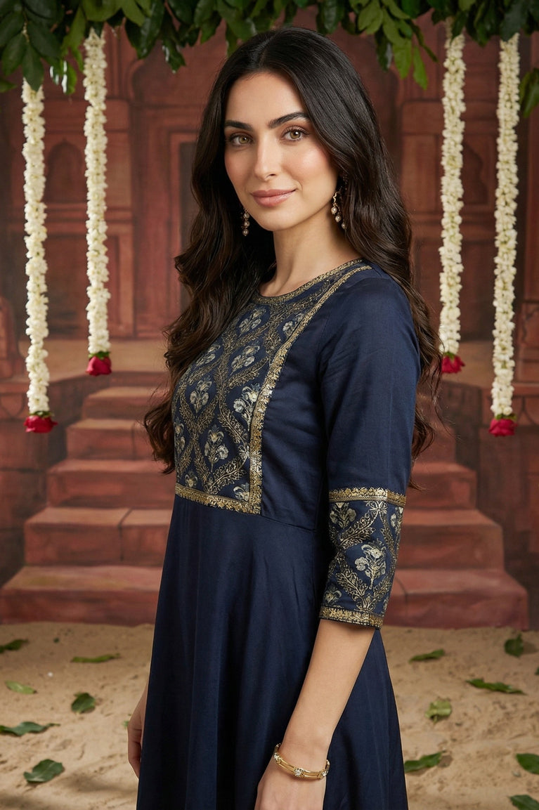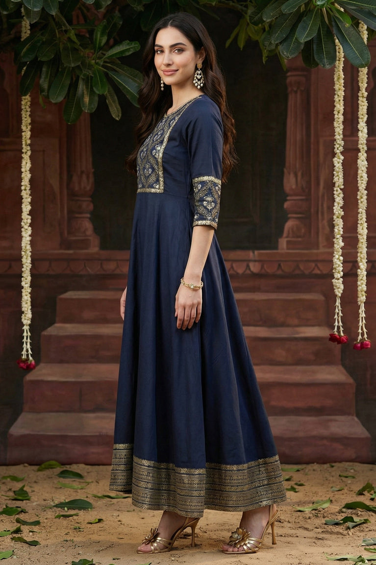 This blue panelled embroidered flared dress is an elegant festive choice. With intricate embroidery across the panels and a flowy silhouette, it exudes graceful movement and charm. Designed for festive gatherings and evening occasions, this dress is a stylish option for women who want ethnic elegance with a modern twist. Its flattering flare enhances feminine charm, while the embroidery adds richness to the ensemble. Pair with statement jewelry and ethnic heels for a complete festive look. Comfortable and stylish, it’s a dress you’ll treasure for special moments.