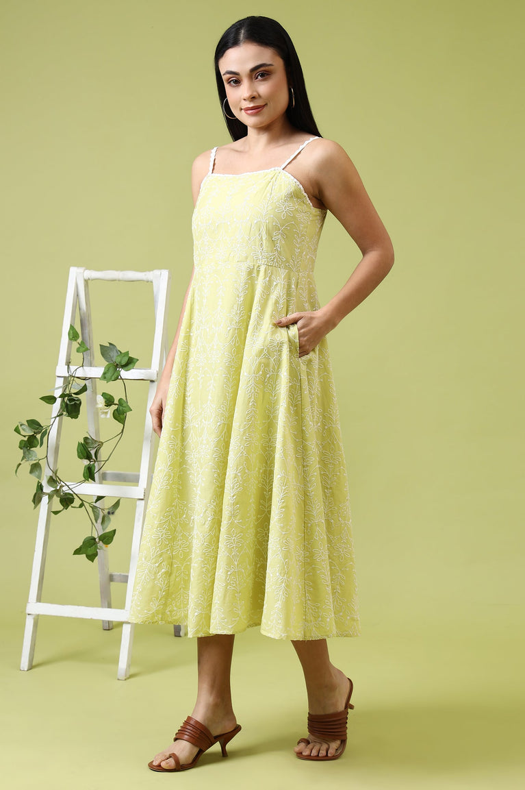 Lime Green Schiffli Embroidered Pure Cotton Flared Spaghetti Dress