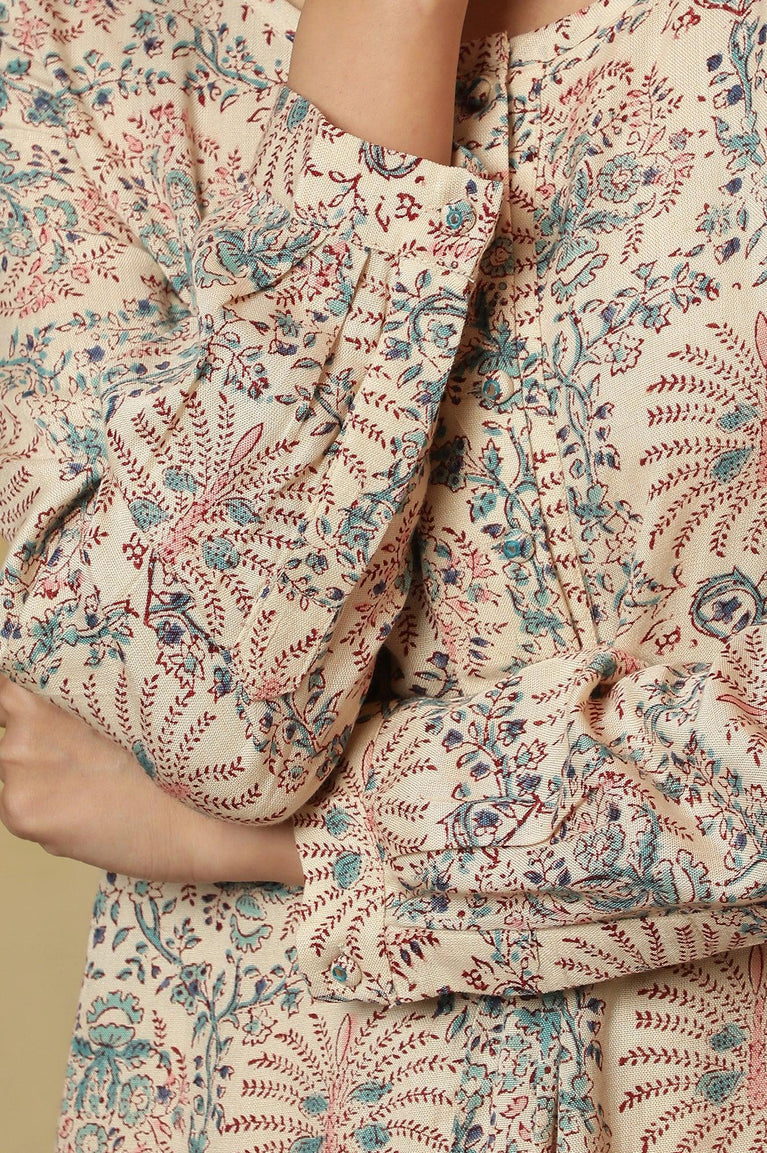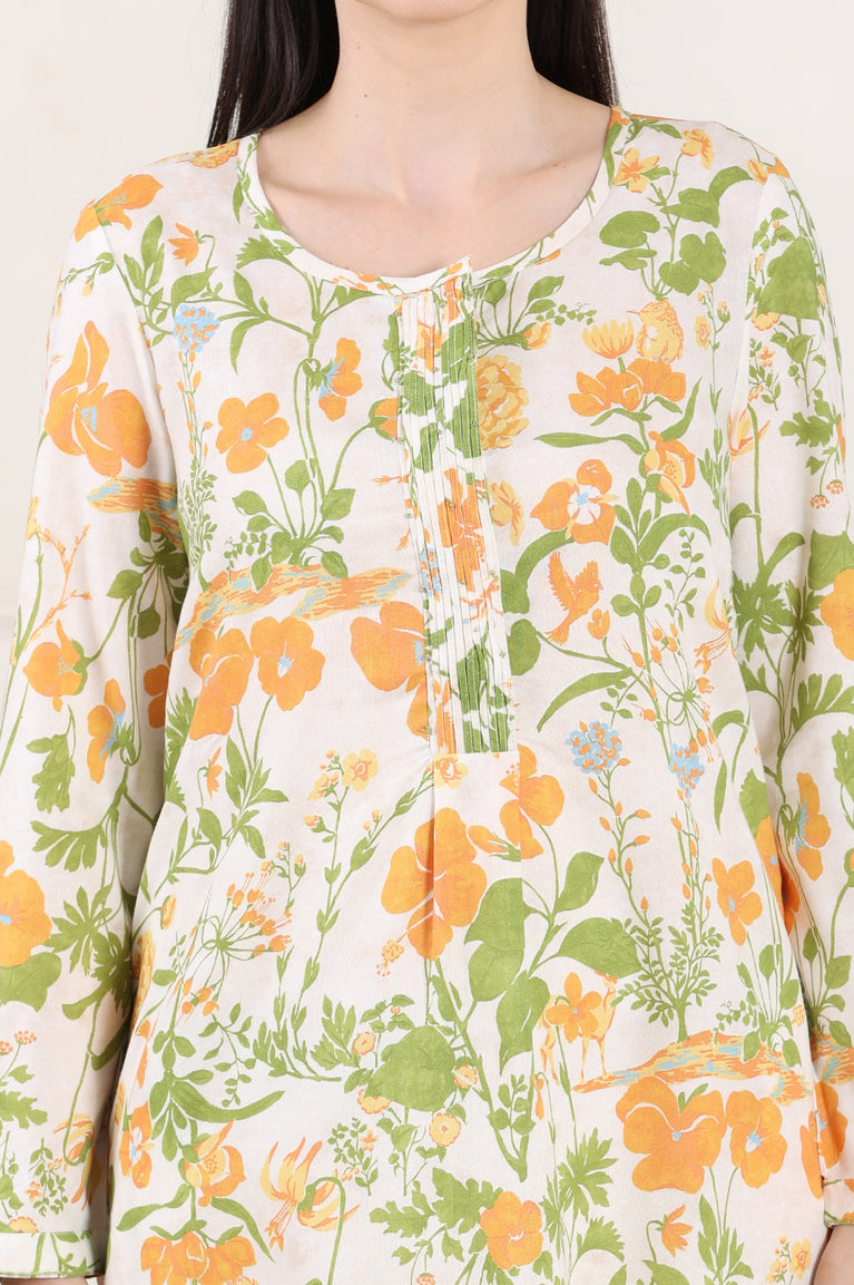 White Floral Printed Rayon Tunic With Pintuck Placket