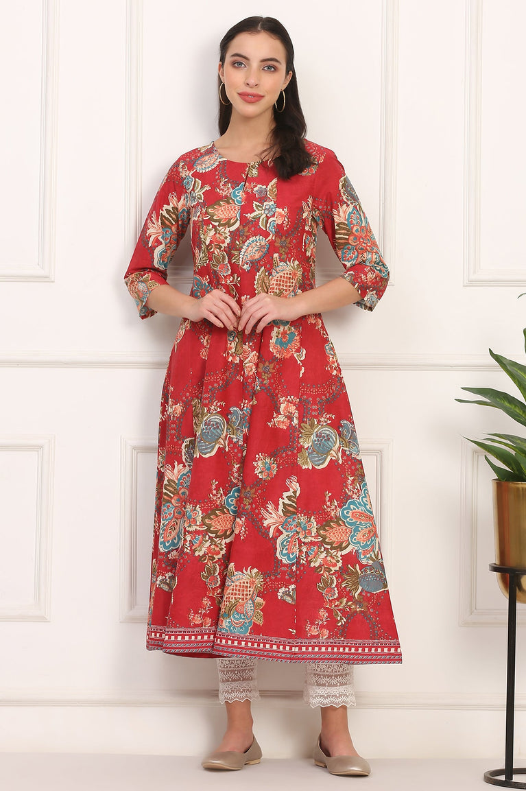 Red Floral Printed Flared Pure Cotton Kurta