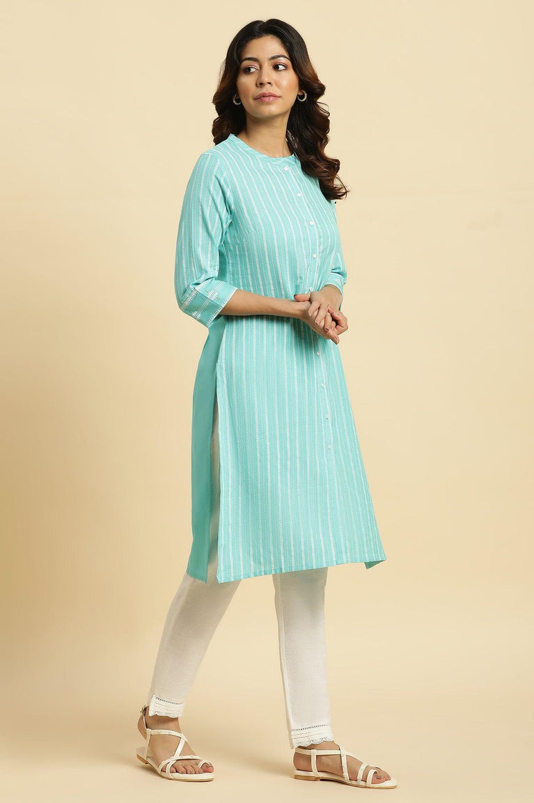 Embrace casual elegance with this meticulously woven blue kurta. Featuring a mandarin collar and full sleeves, this ethnic garment offers a perfect balance of comfort and style. The straight cut silhouette ensures a flattering fit for all body types. Crafted from a blend of 12% flax and 88% cotton, this kurta provides exceptional breathability and durability. The striped pattern adds a contemporary touch to the traditional design, making it suitable for various casual occasions. This versatile piece seamlessly combines ethnic charm with modern aesthetics, allowing you to effortlessly transition from day to evening wear. The flax component in the fabric adds a subtle texture, enhancing the overall appeal of this timeless kurta.