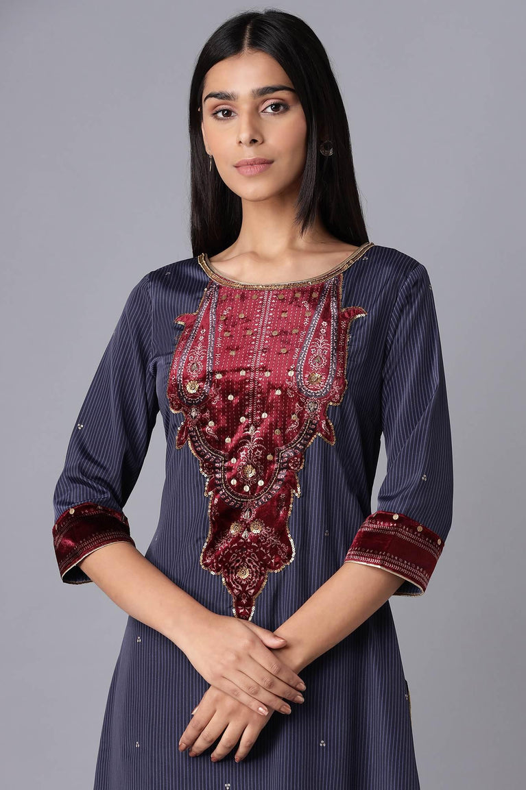 Move to festivities and celebrations with this premium french crepe blue kurta. The kurta is crafted in foil print technique and has stripe print. It also features sequin detailing velvet patched yoke.