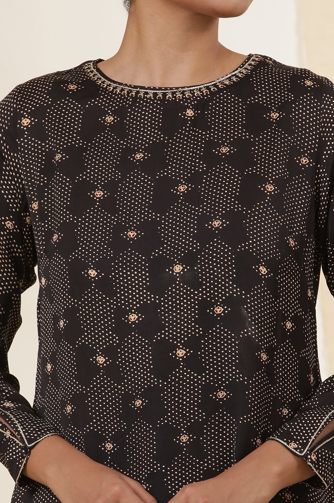 Black Printed Modal Sain Kurta With Neck Embroidery