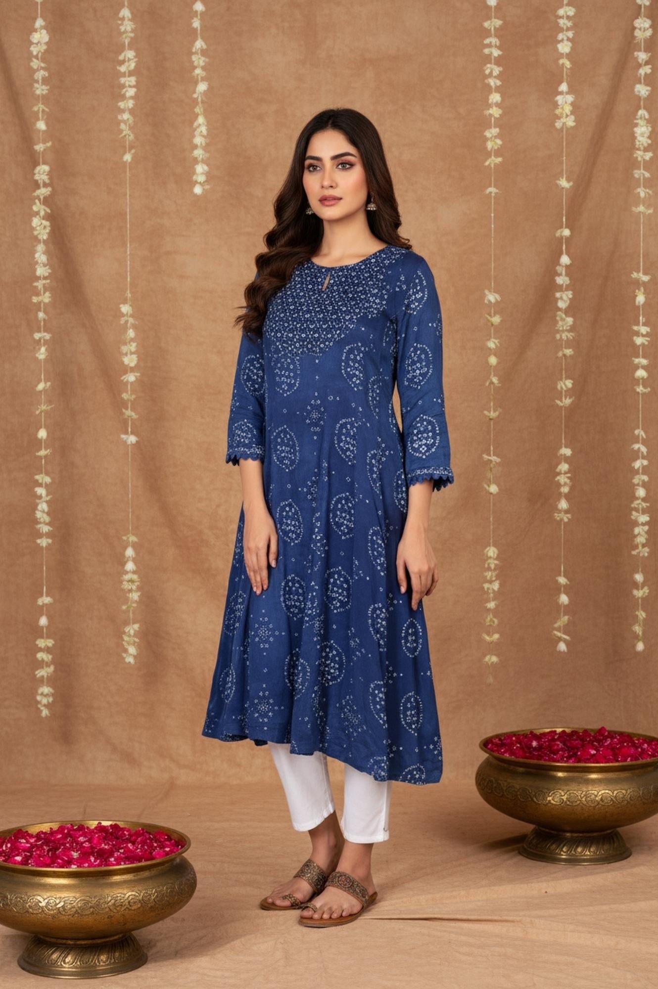 A timeless piece of artistry, this blue bandhani print kurta is a celebration of traditional elegance. The flared silhouette, crafted from soft modal satin, flows gracefully, while the intricate mirror work embellishments add a touch of festive charm. The keyhole neckline and three-quarter sleeves enhance its sophisticated appeal, making it perfect for cultural gatherings or festive occasions. Pair it with white palazzos and silver accessories for a complete ethnic look.
