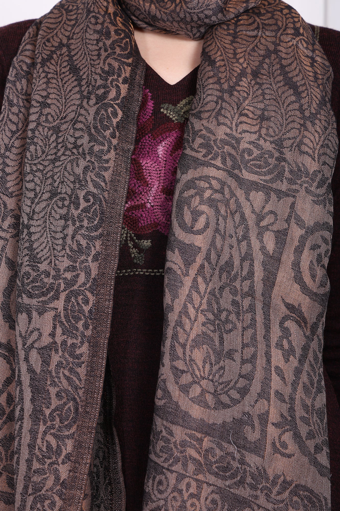 A whisper of heritage for the modern muse, this exquisite shawl for women is a masterpiece of classic textile art. It's the kind of piece you'll reach for when you want to add a layer of quiet sophistication. Intricately woven from a warm, soft wool-blend fabric, it feels wonderfully luxurious against the skin, promising comfort on cooler days. The stunning design showcases a timeless, all-over paisley pattern in sophisticated shades of Earthen Brown and Charcoal, a beautiful result of its traditional yarn-dyed creation. This beautiful ethnic stole is further enhanced with subtle metallic fibres woven throughout the fabric, which catch the light with a gentle, understated shimmer that lends it an air of quiet opulence. Measuring a generous 2.1 metres in length and 75cm in width, this designer wrap offers endless versatile styling options—drape it elegantly over the shoulders or loop it for a cozier feel. Its completely opaque fabric provides modest and graceful coverage, while the edges are perfectly finished with a delicate, short fringe, adding a touch of classic texture. Ideal for festive gatherings, formal events, or simply elevating your everyday winter style, this elegant ethnic wrap for women is a truly timeless addition to your accessory collection.