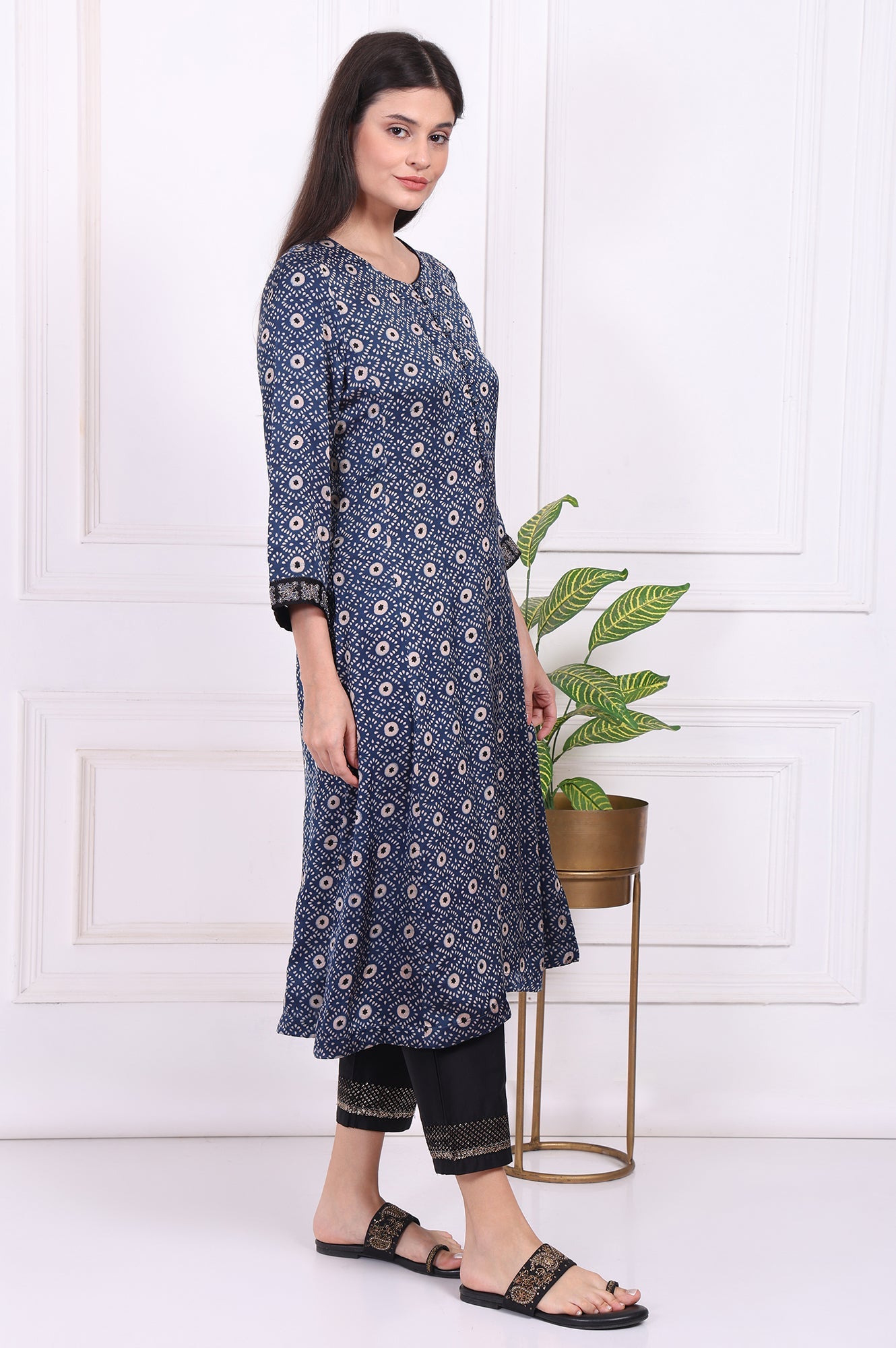 Navy Blue Geometric Printed Embroidered Modal Satin Straight Kurta