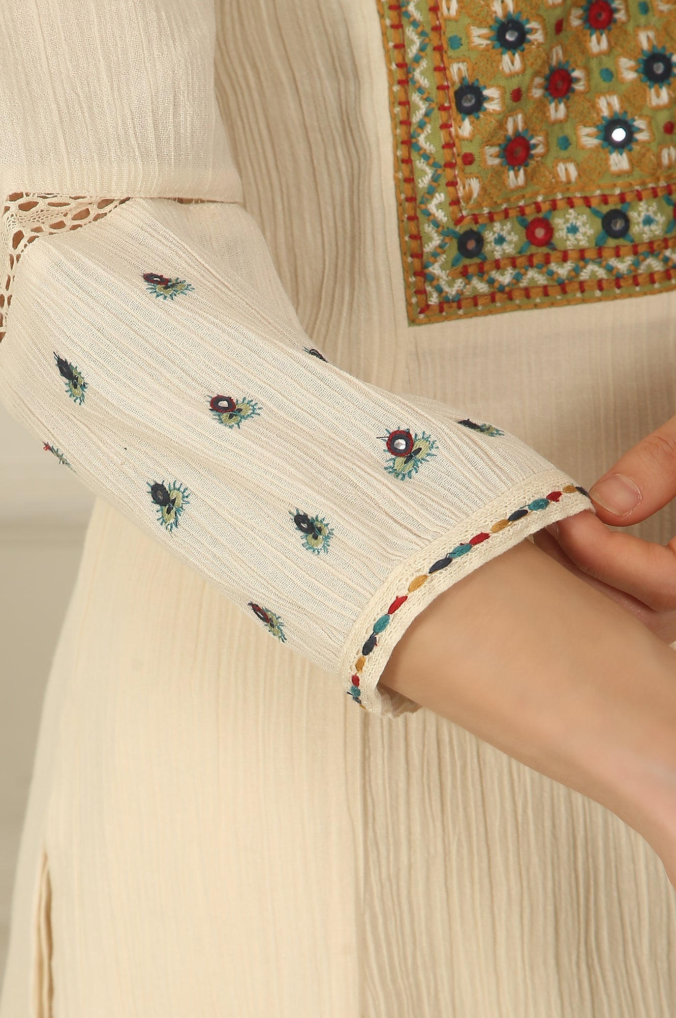 White Embroidered Yoke Cotton Crepe A-line Kurta, Pants and Dupatta Set