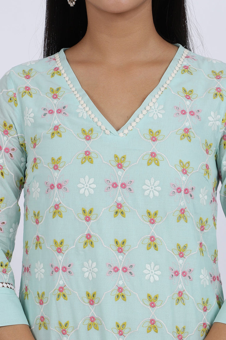 Blue Embroidered Lace Pure Cotton Straight Kurta & Straight Pant Set