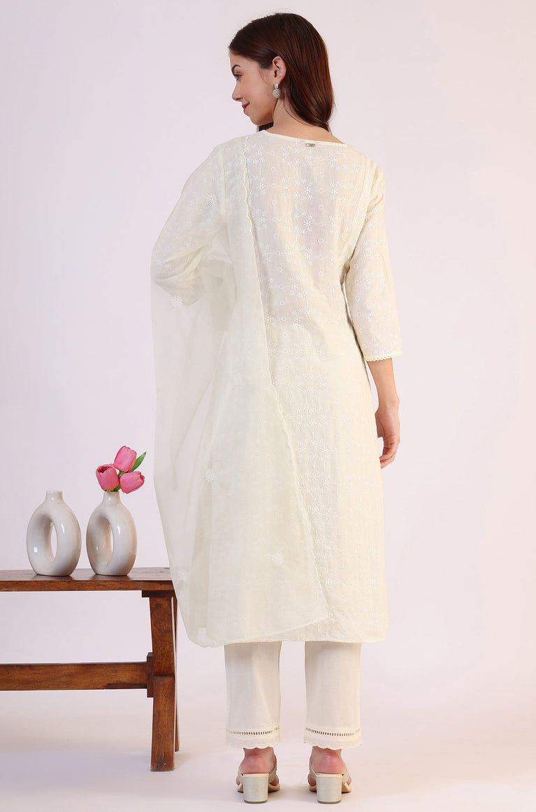 White Embroidered Lace Straight Pure Cotton Kurta & Straight Pant With Dupatta Set