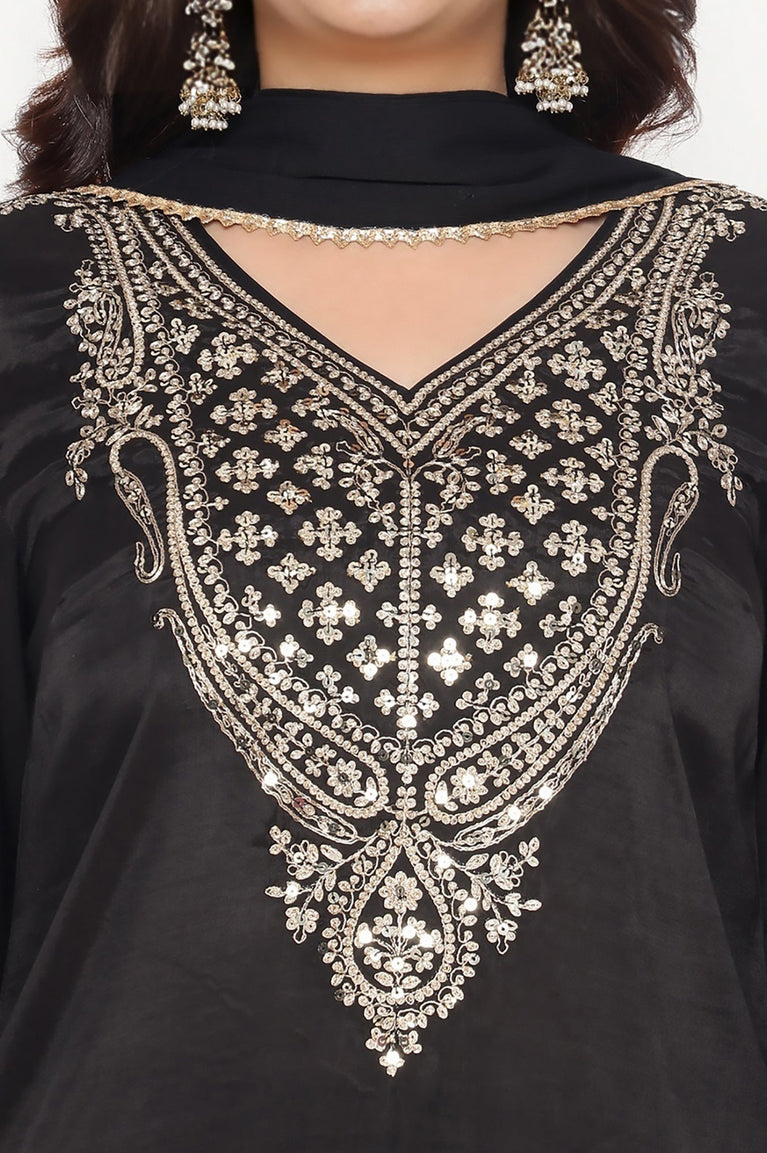 Black Solid Printed Shantung Straight Kurta, Straight Pant and Dupatta Set