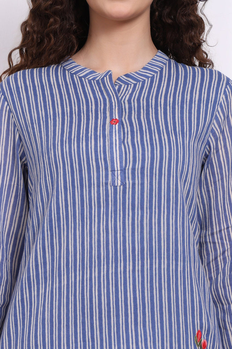 Crafted in breathable pure cotton, this top effortlessly combines classic embroidery with subtle print elements. The soft blue palette makes it suitable for daywear, while the detailed thread work introduces a handmade appeal. Ideal for warm weather, the fabric keeps it airy and cool, while the structured cut offers a crisp silhouette that layers well with ethnic or fusion bottoms. This is a staple for anyone seeking a blend of craft and comfort in daily wear. It’s versatile enough for college, work-from-home days, or casual errands.