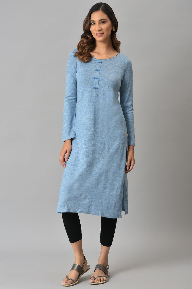 Blue Cotton Lurex Festive Kurta With Embroidered Neckine