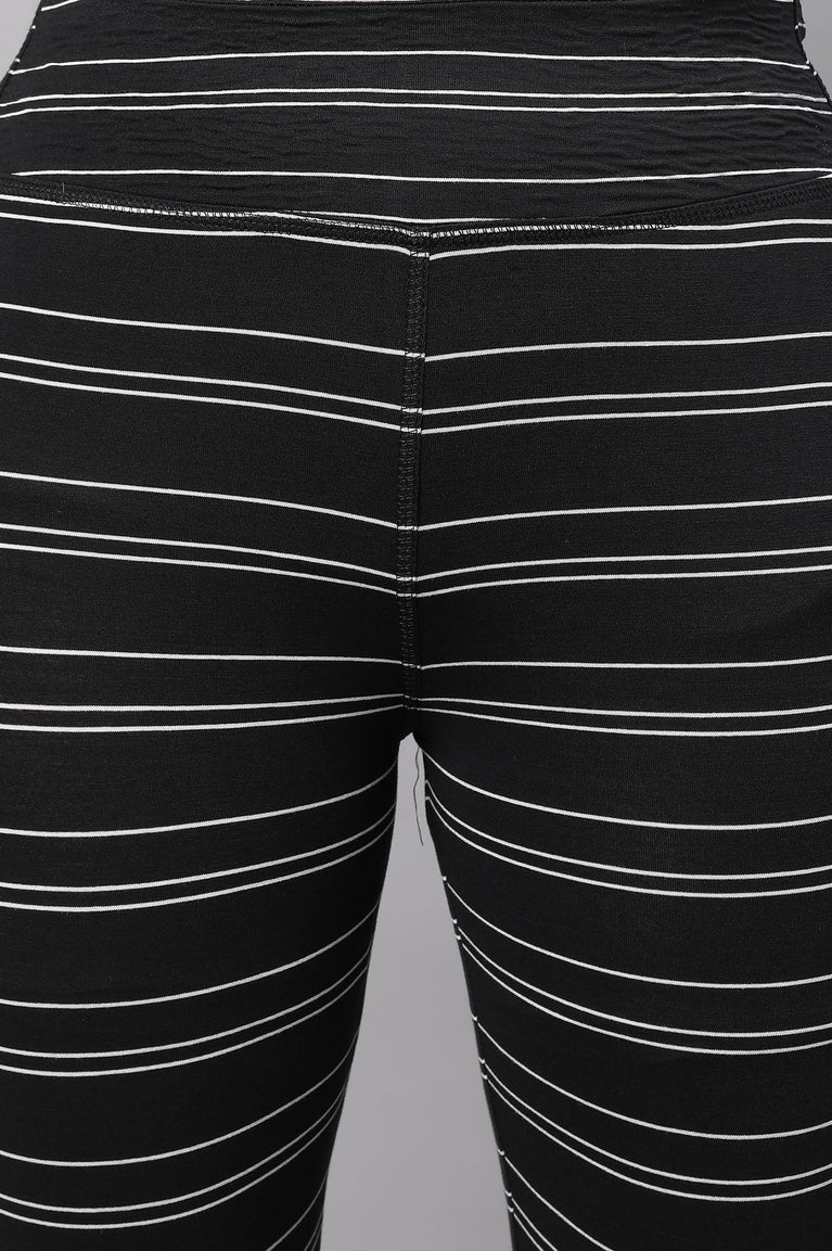 Black Striped Skinny Fit Cotton Tights With High Waistband