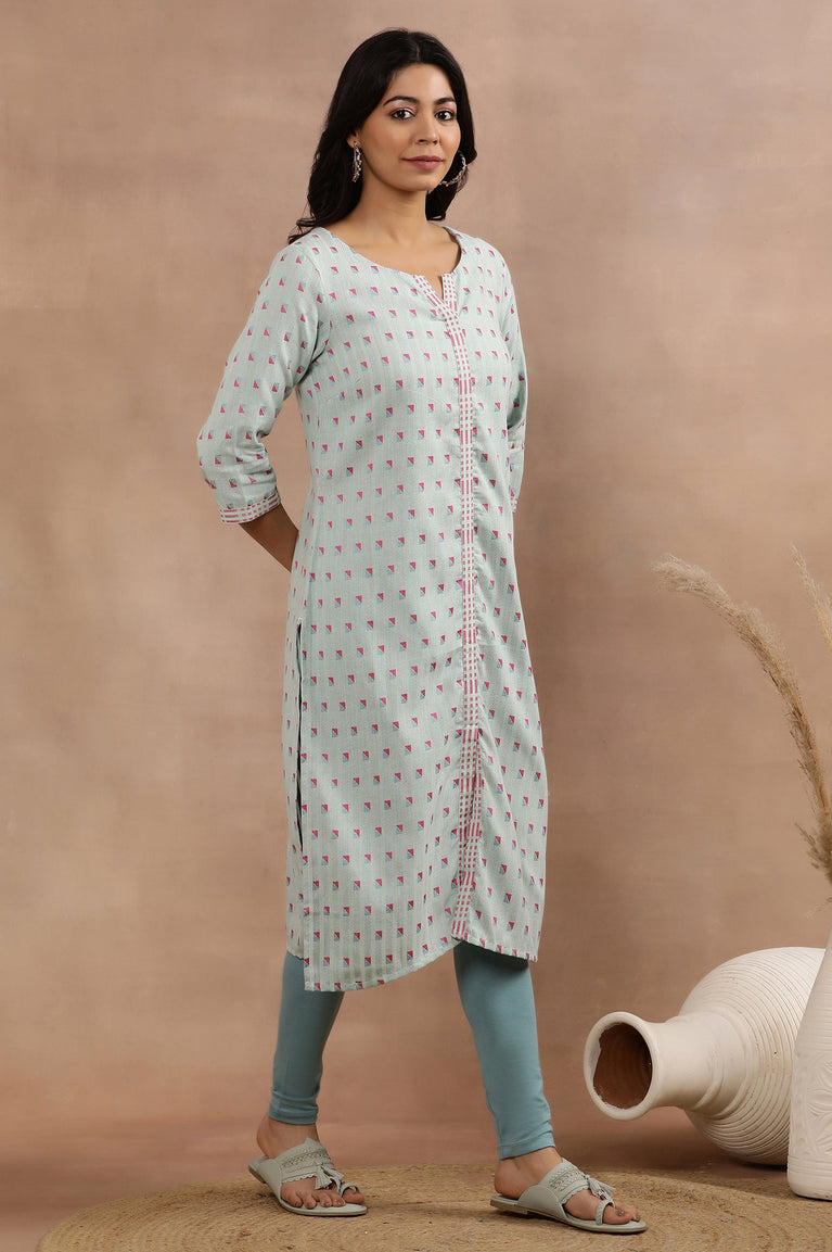 Blue Printed Cotton Dobby Kurta And Tights