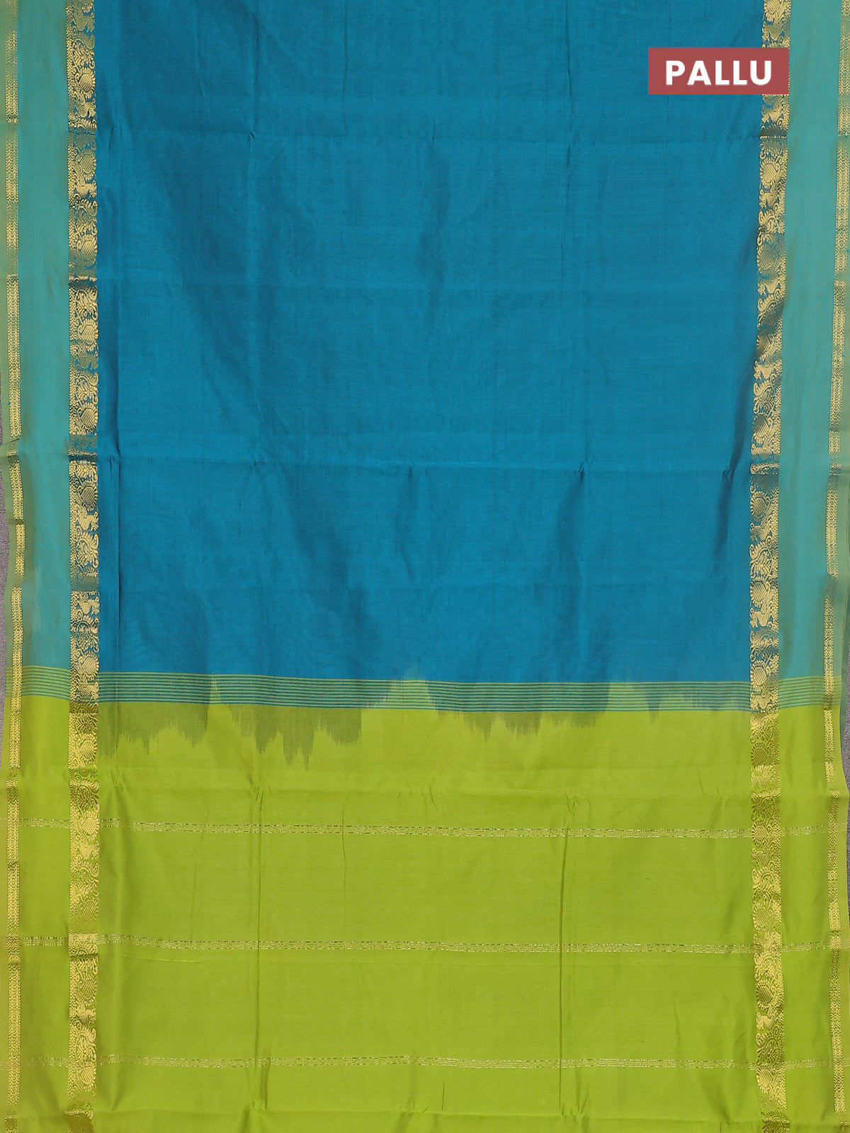 10 yards Poly cotton saree peacock green and lime green with plain body and rettapet zari woven border