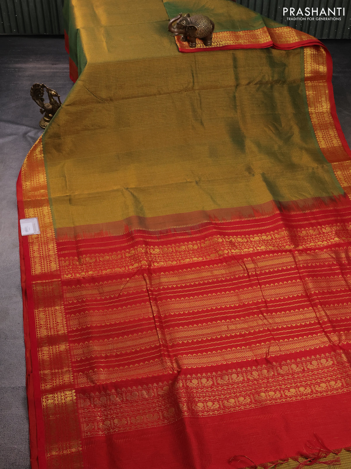 10 Yards silk cotton saree mehendi green and red with allover small zari checked pattern and zari woven border