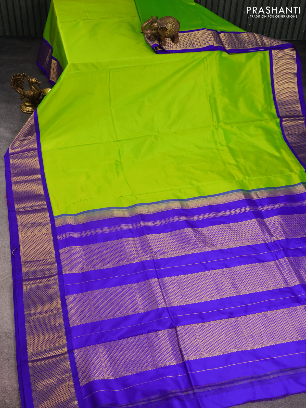 10 Yards silk saree fluorescent green and blue with plain body and zari woven border