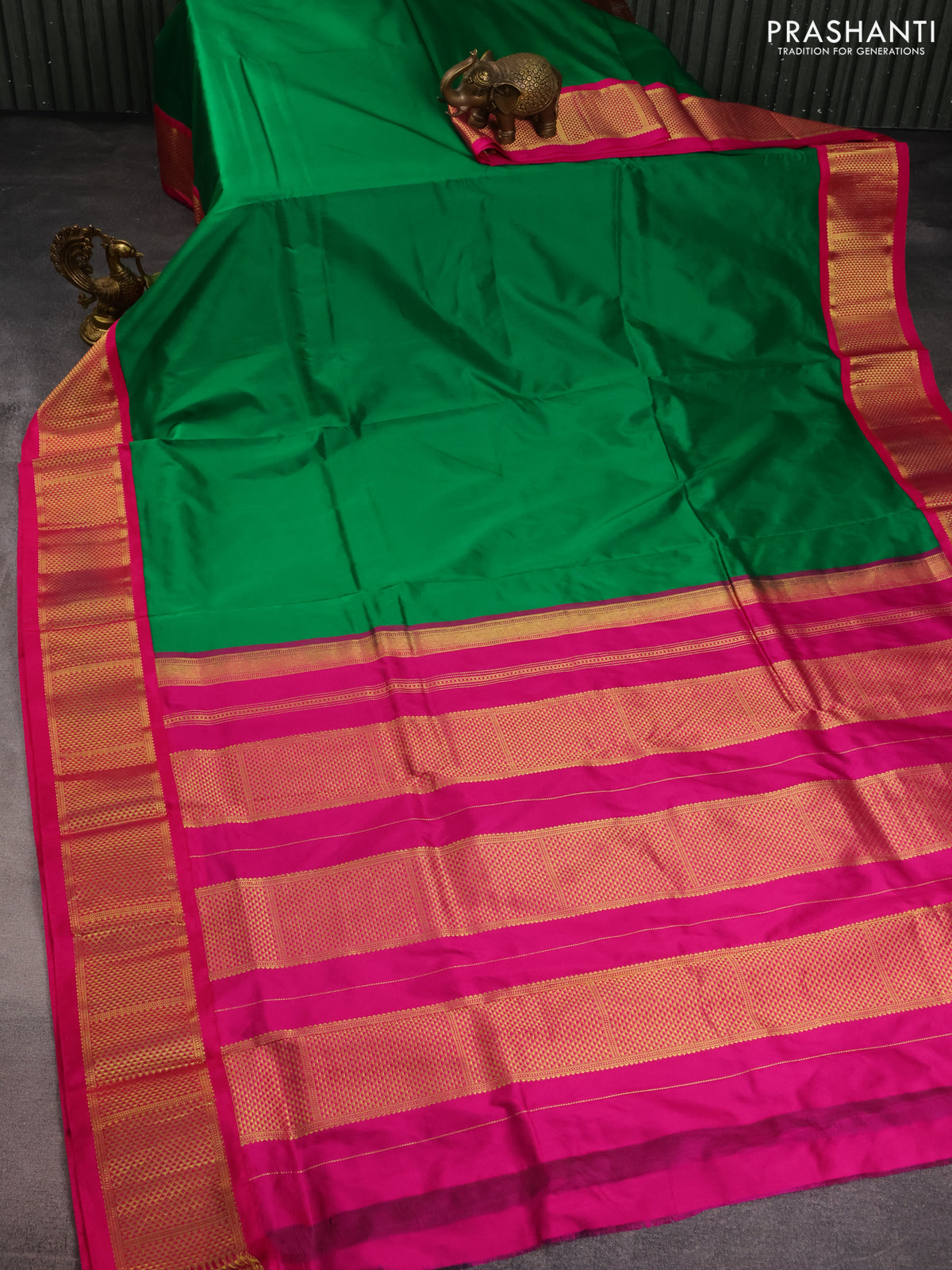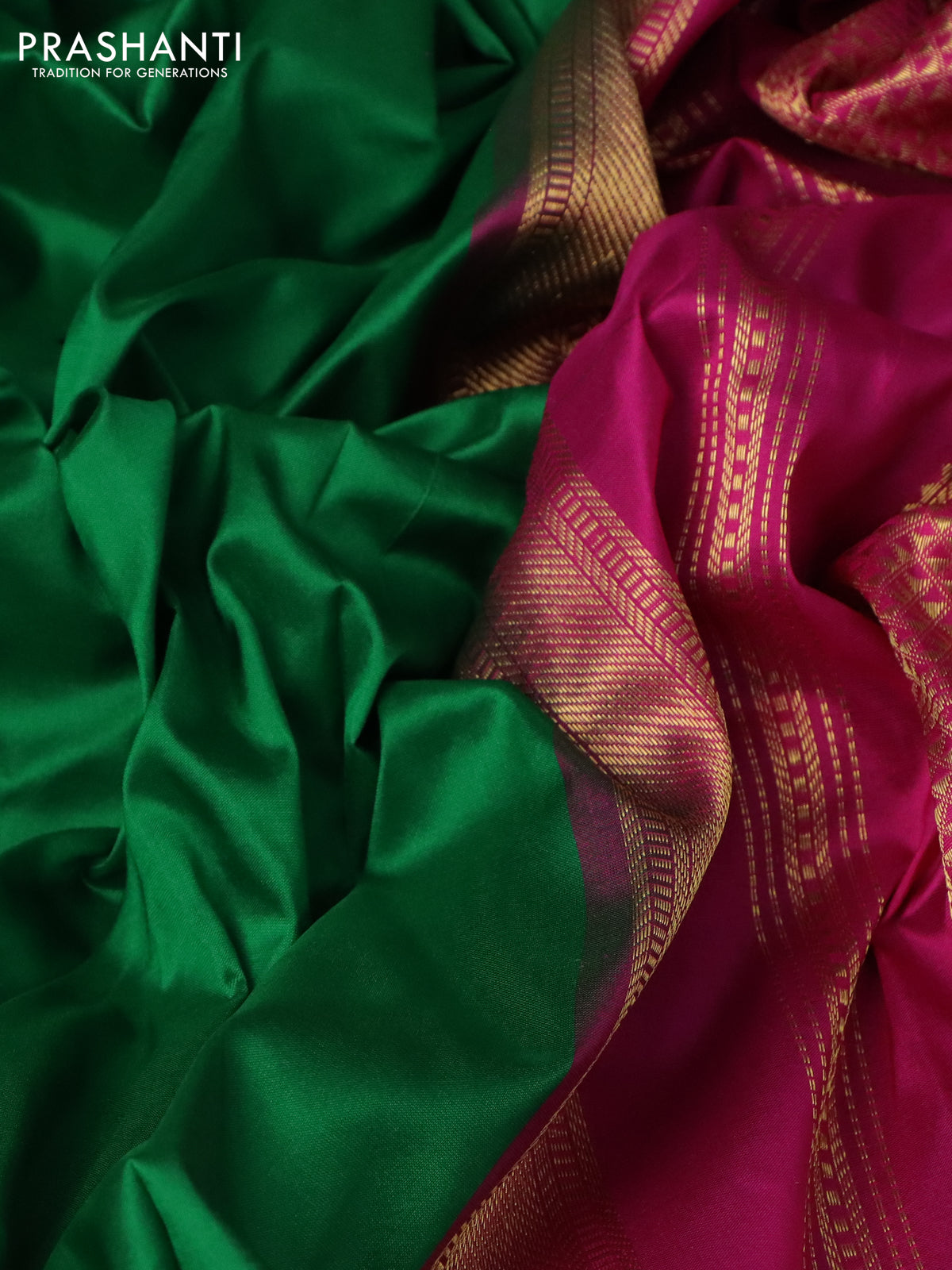 10 Yards silk saree green and pink with plain body and zari woven border