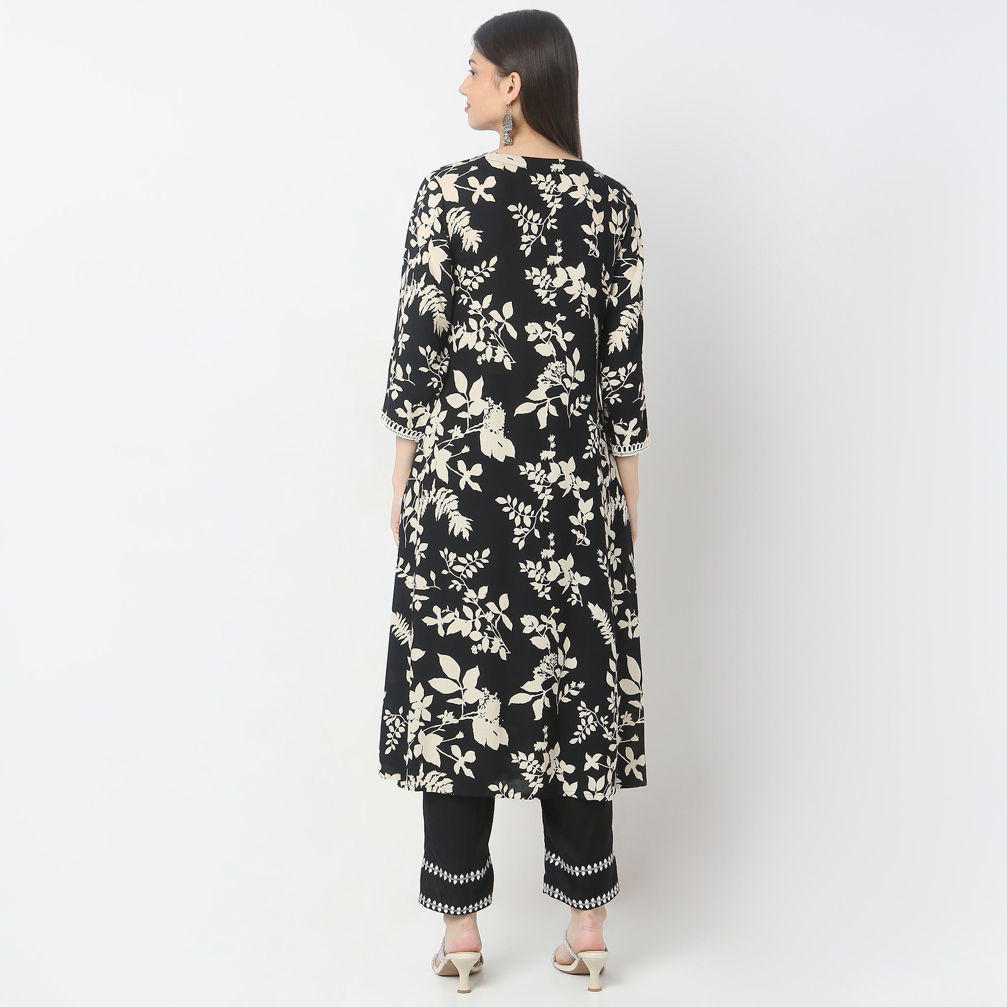 A-Line Printed Knee Length V-Neck Flared Kurta