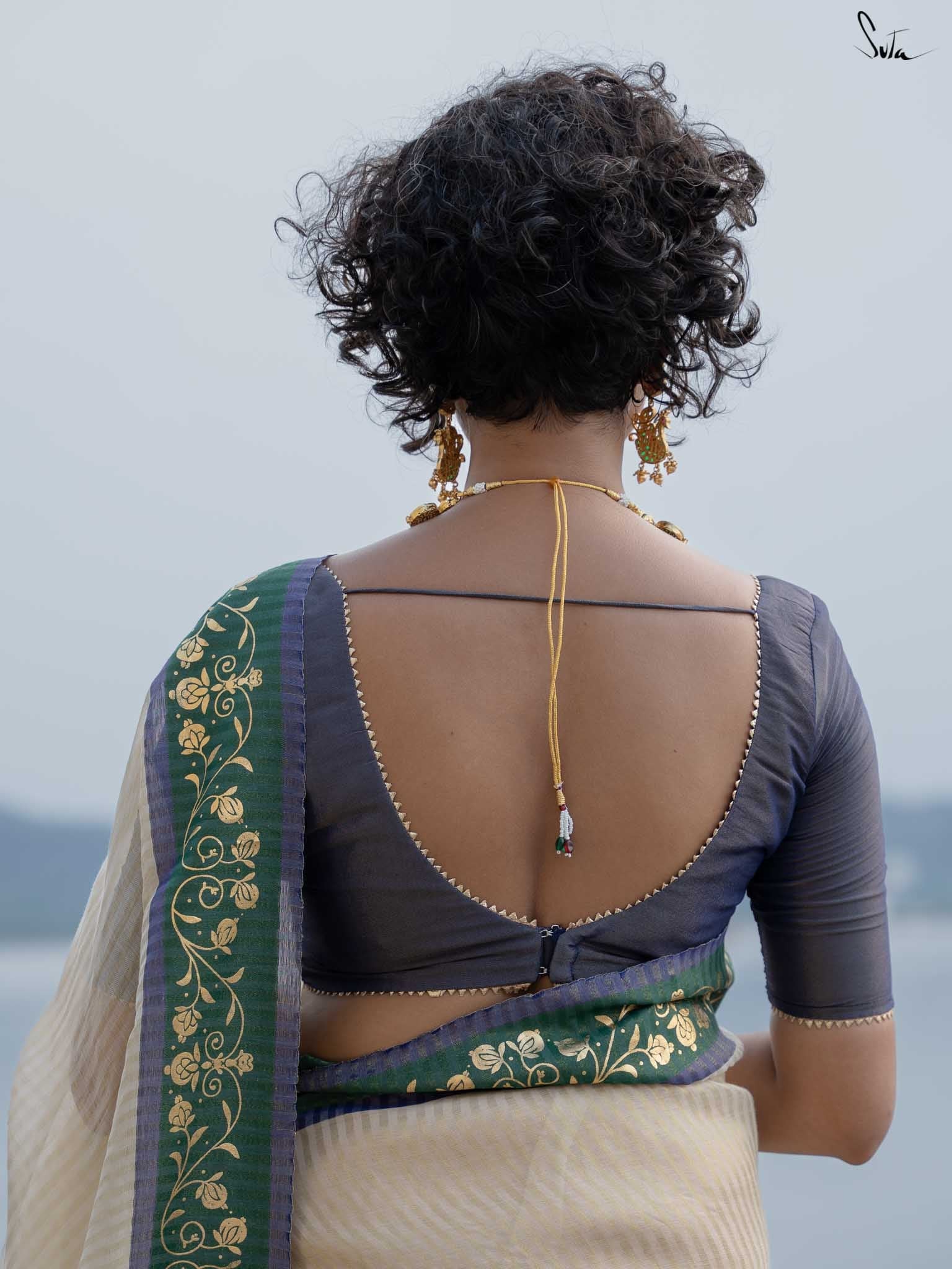 Reflect the beauty of the evening sky with Aasmani Chhavi, a soothing blue gold blouse from Suta’s Taara collection, crafted from viscose tissue. This blouse features a flattering sweetheart neckline and elbow-length sleeves adding a soft shimmer to your look. The gold lace detailing enhances the blouse’s elegance, merging comfort with a touch of twilight for those everyday moments.